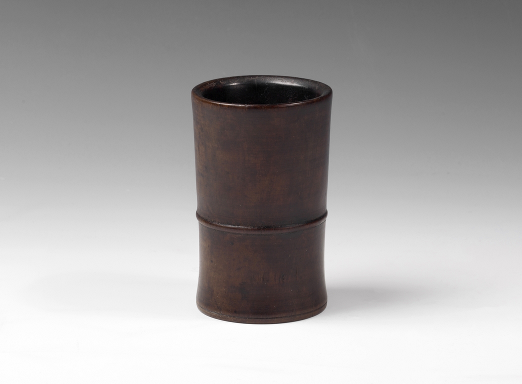Of cylindrical shape, the huangyangmu brush pot was carved to depict a section of bamboo trunk. Qing Dynasty period.