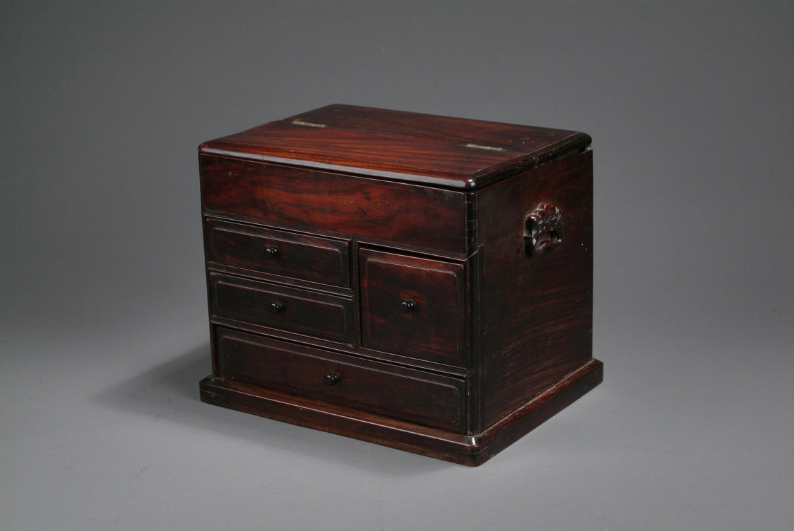 Of rectangular shape, the front of cabinet has four drawers, three rectangular and one square. The top opens to a two-compartment storage, one square and one rectangular. Deep and rich natural color all around, with two handles on the side. 18th century.
