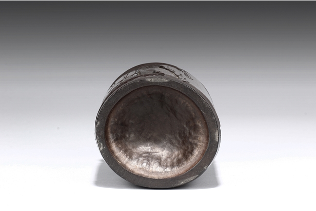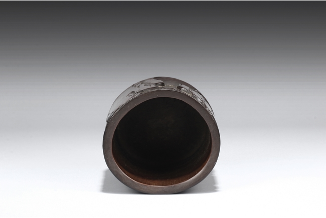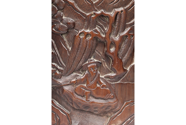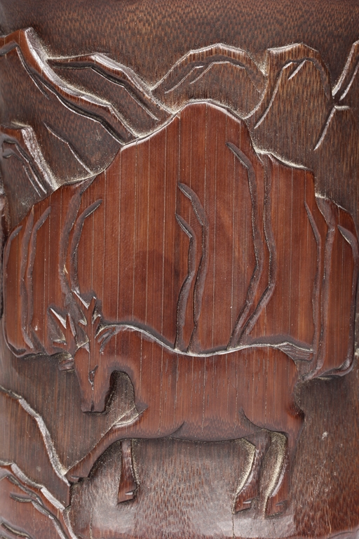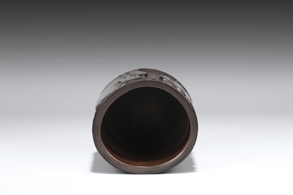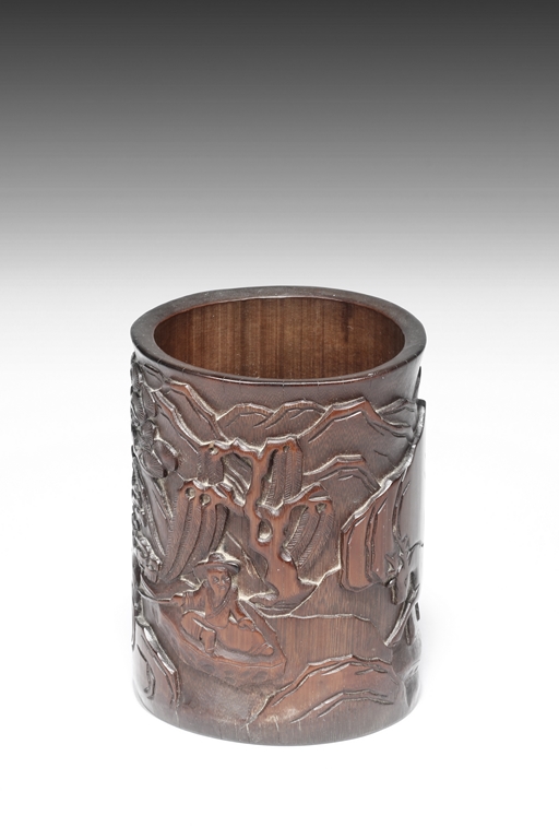 The exterior is carved in openwork showing an old man seated next to pine trees fishing in a river amongst rocks and mountains. The opposite side is carved with a wandering deer amidst mountain. The brush pot is of cylindrical in shape. Late Qing Dynasty Period.