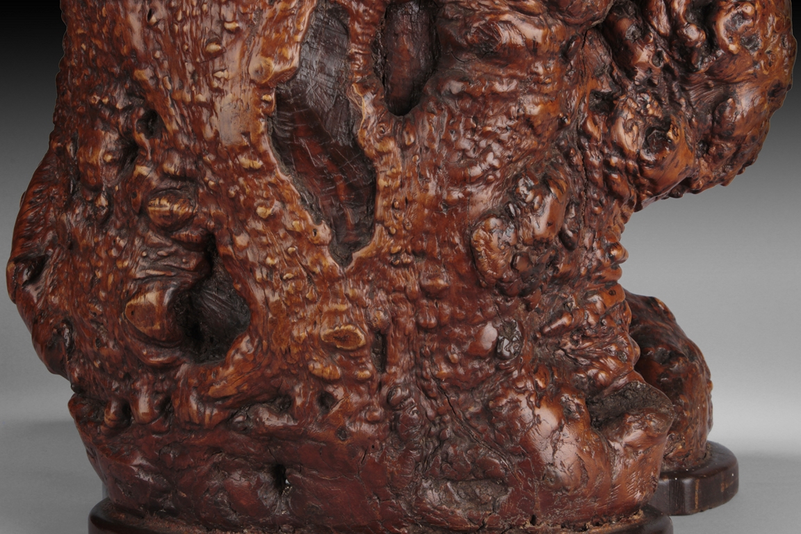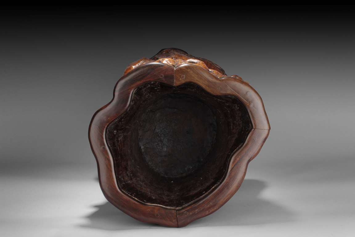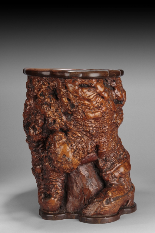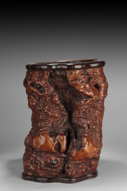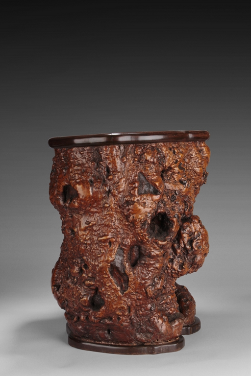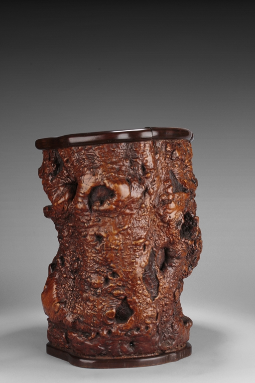 Of irregular cylindrical form and unusually large size, the ironwood brush pot is carved naturalistically with bumps, creases, small holes, and wrinkled surfaces, the top and bottom are decorated with wooden rim, all with natural color and grain. 19th century. Provenance: Estate of Thomas Chang.