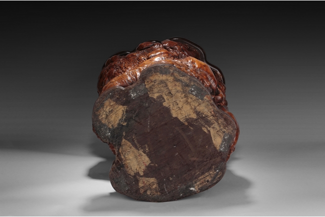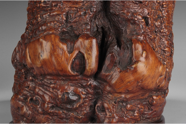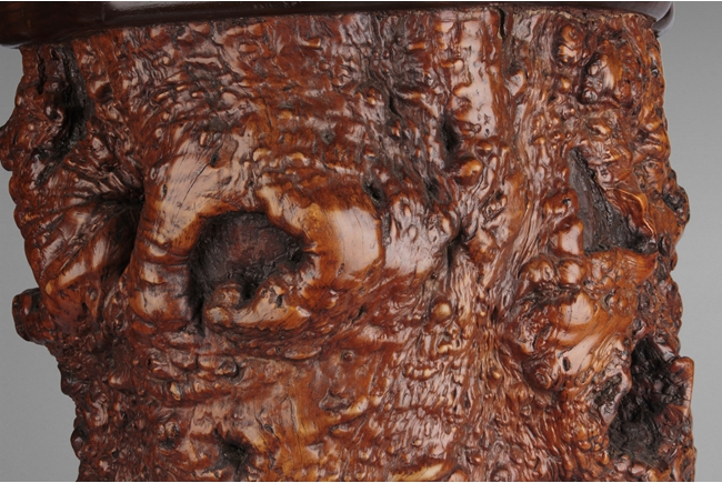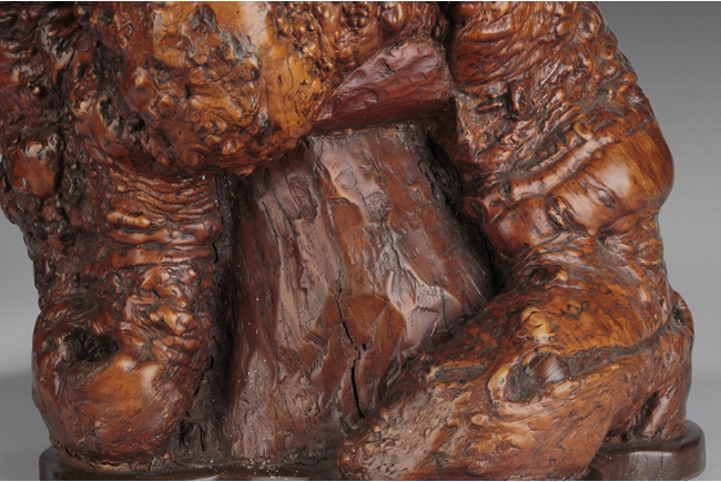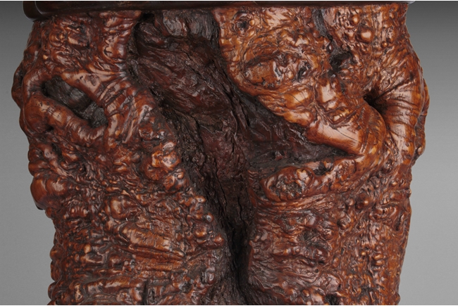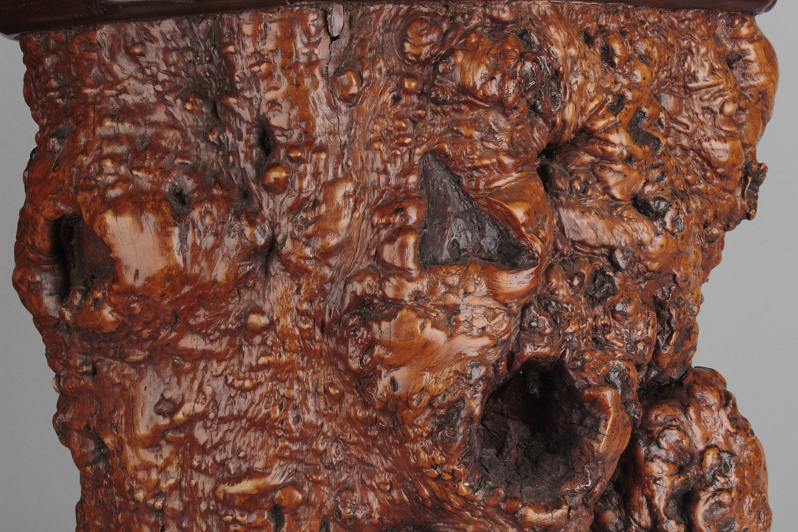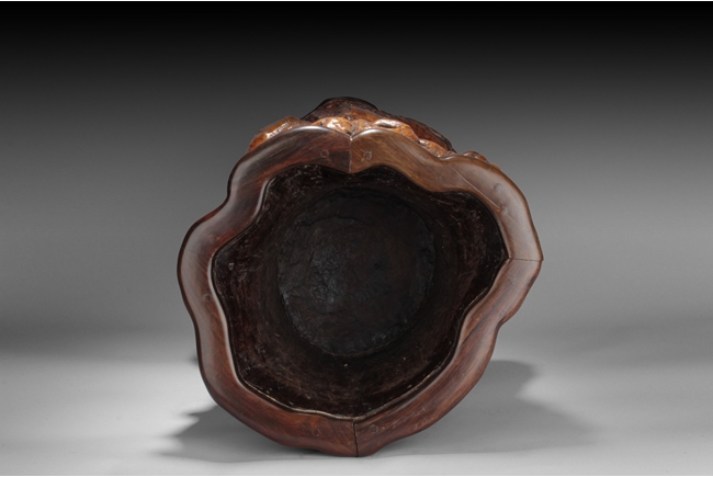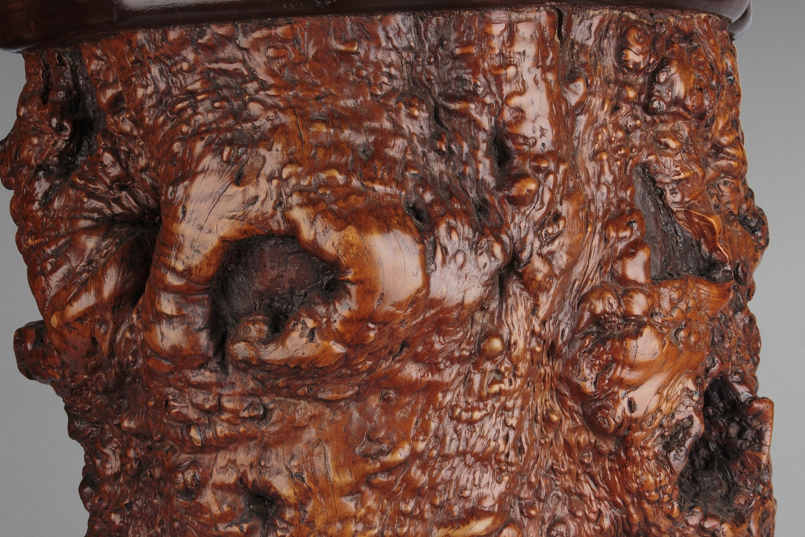Of irregular cylindrical form and unusually large size, the ironwood brush pot is carved naturalistically with bumps, creases, small holes, and wrinkled surfaces, the top and bottom are decorated with wooden rim, all with natural color and grain. 19th century. Provenance: Estate of Thomas Chang.