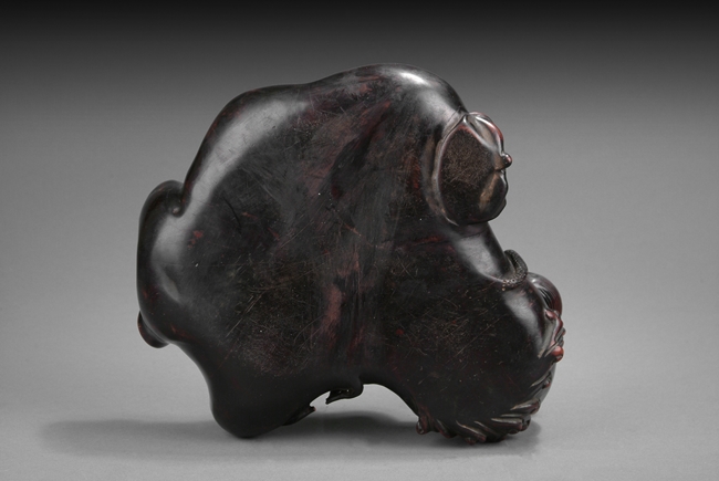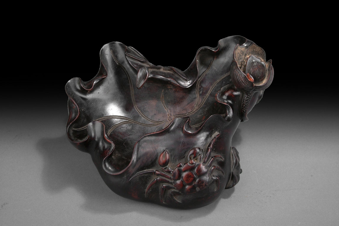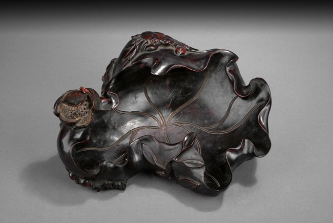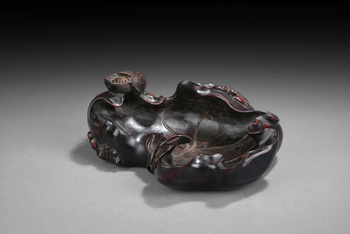 The figure carved as a large lotus leaf and blossoms, well-hollowed to form a receptacle, all borne on the entwined stems of leaves, gradually extending up to the sides, a single crab residing near the lotus, the smoothly polished Zitan of rich black with hints of red. Qing Dynasty period.