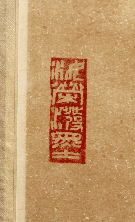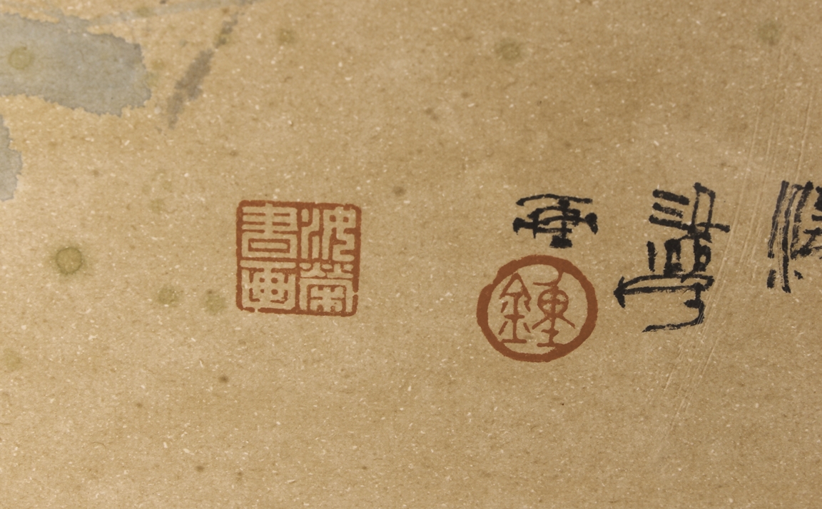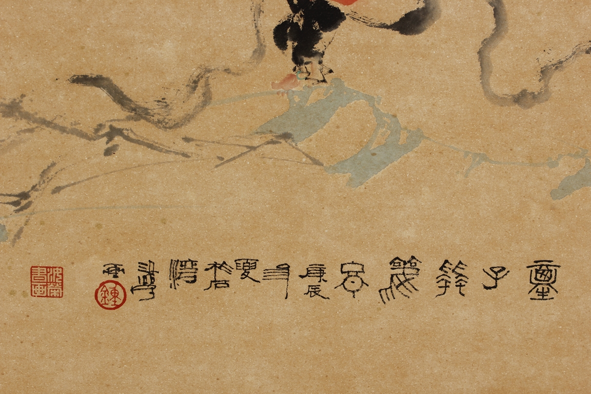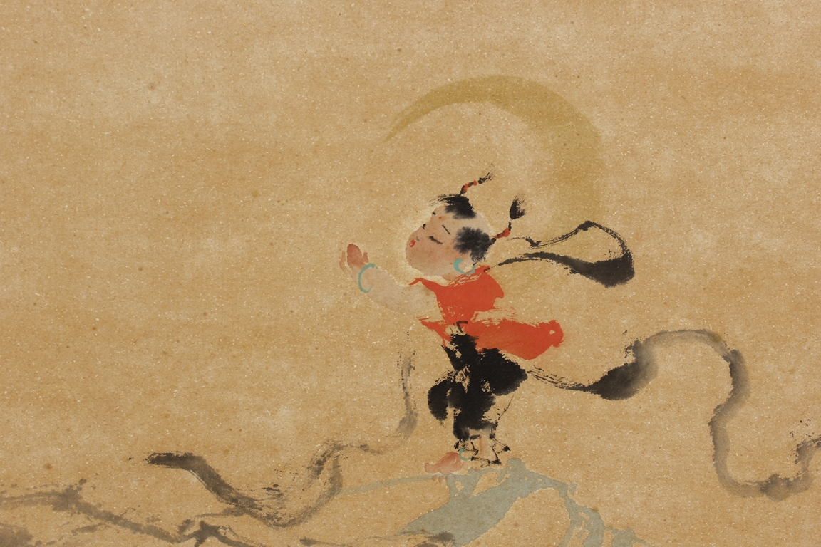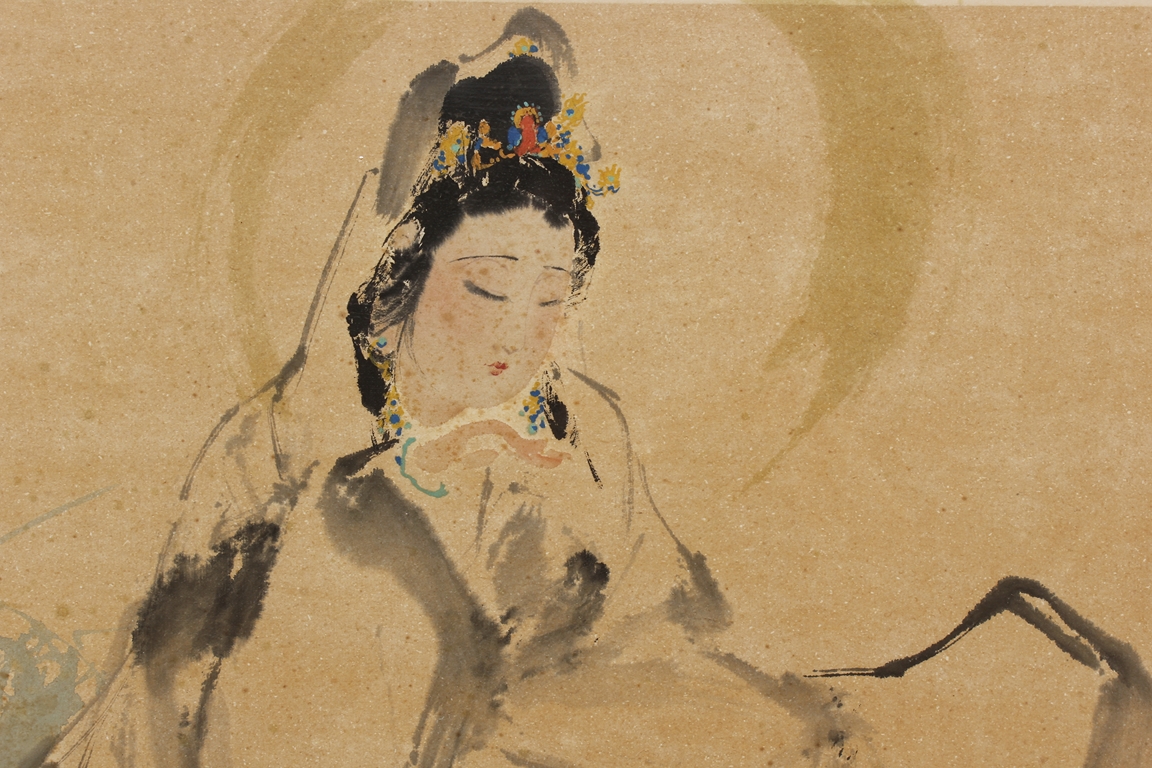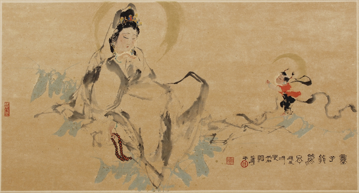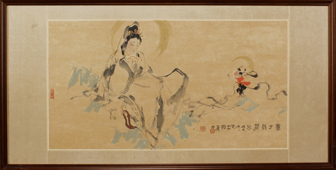 The framed painting depicts a celestial child flying towards the serene Guanyin, seated over ocean. Chinese colophon, artist signature and mark on the bottom, additional mark on the left.