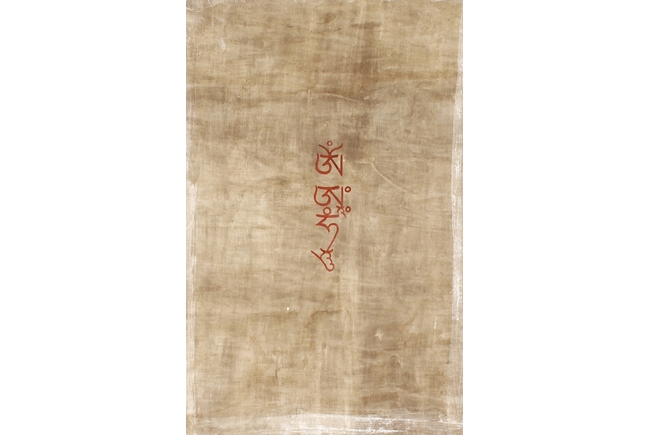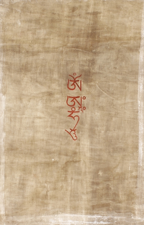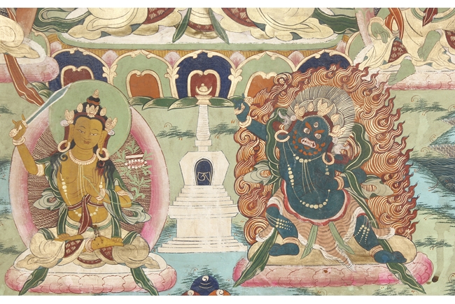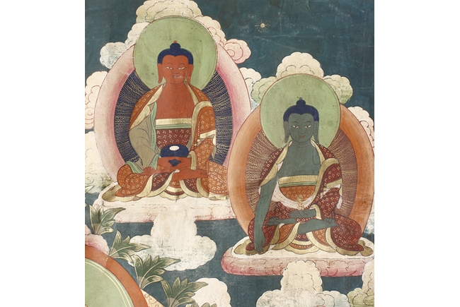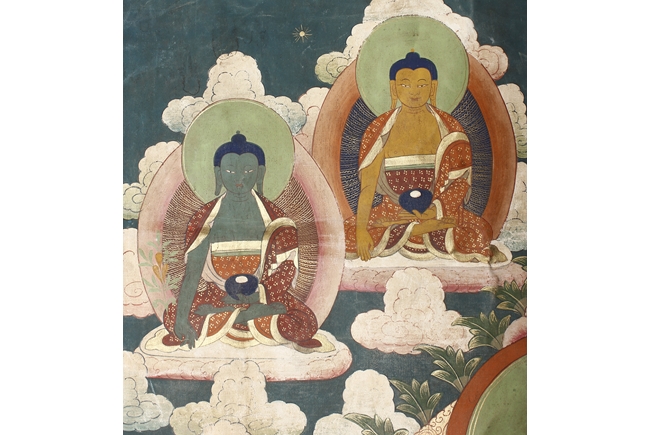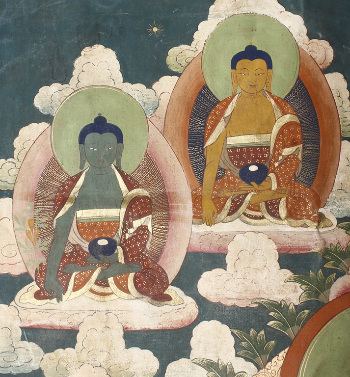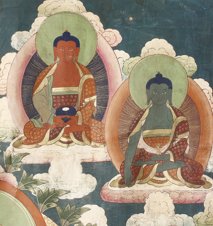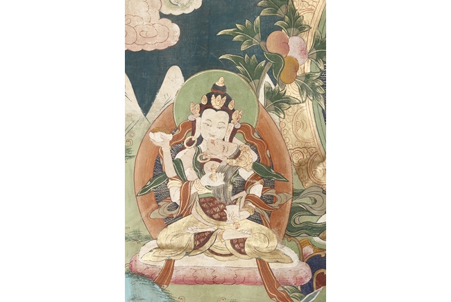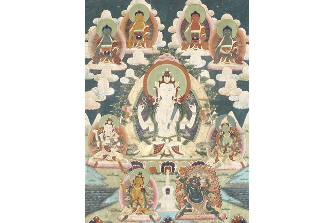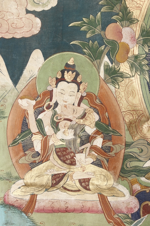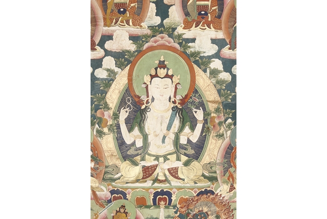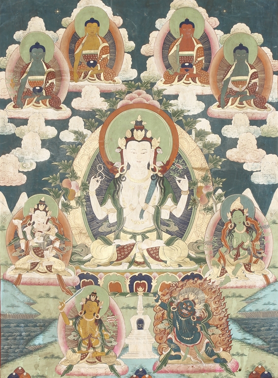 This thangka is painted on a cloth with depiction of the four-armed Shadakshari Lokeshvara as the central figure seated in dhyanasana, surrounded by deities and monks holding various objects seated before vibrant orange and pinkish mandorlas all upon green background. Qing Dynasty Period.