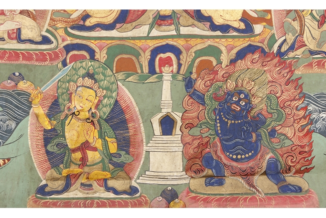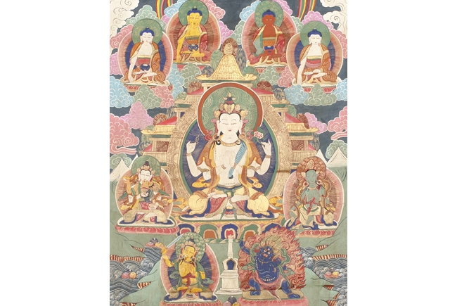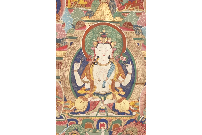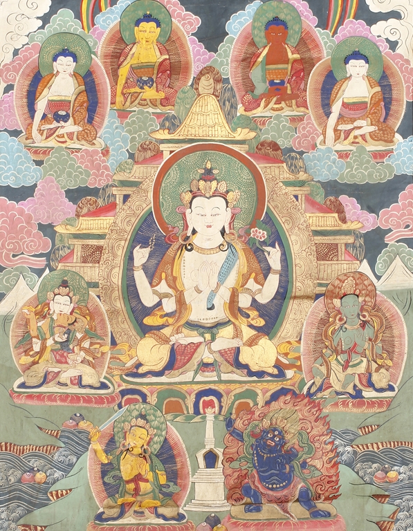 This thangka is painted on a cloth with depiction of the four-armed Shadakshari Lokeshvara as the central figure seated in dhyanasana against the background of golden palace. He is surrounded by deities and monks holding various objects seated before vibrant orange and pinkish mandorlas upon green background. Qing Dynasty Period.
