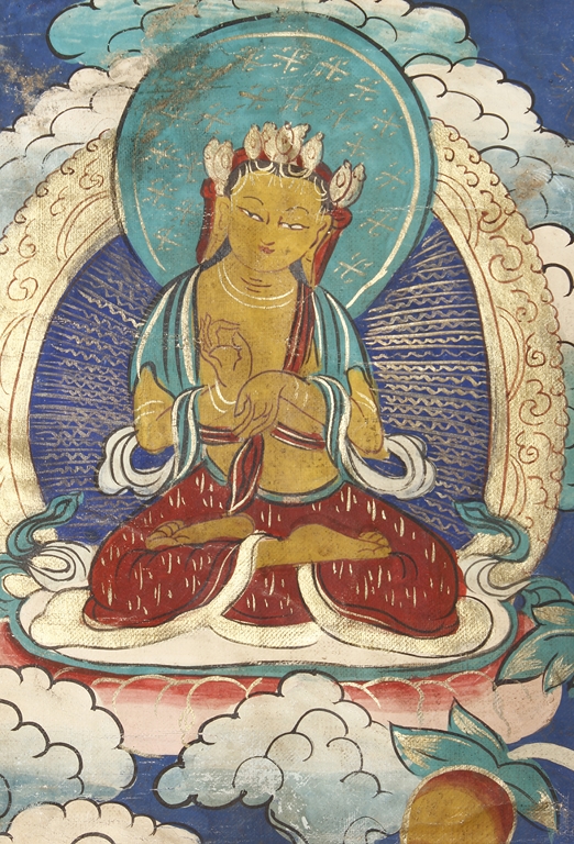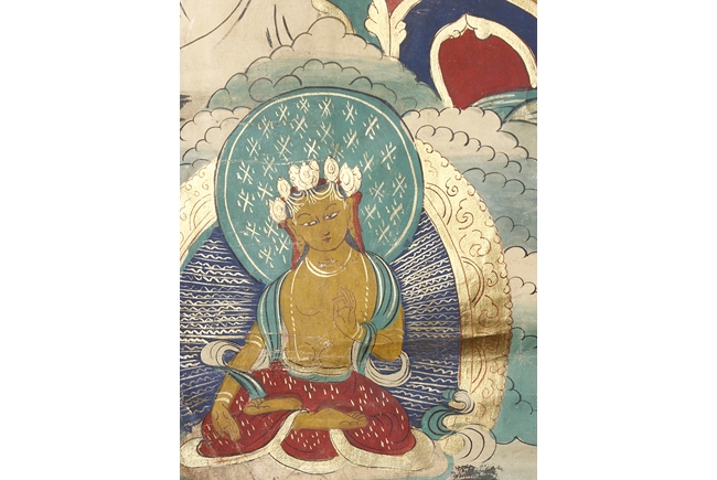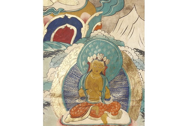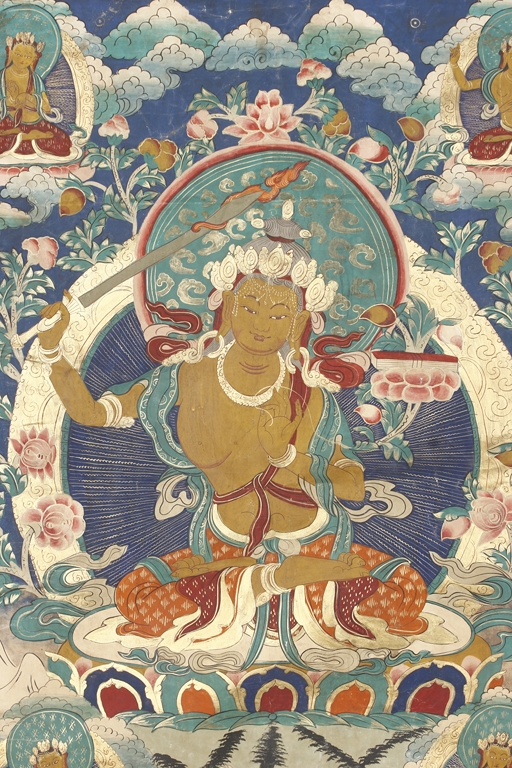 Painted on a cloth, this thangka features Manjusri raising up a sword on right hand and seated in dhyanasana aganist a blue and ivory colored mandorla. His face is vividly drew with benevolent and serene expression and hair tied in a topknot against a green roundel. He is surrounded by deities with similar blue mandorlas amidst clouds. Qing Dynasty period.