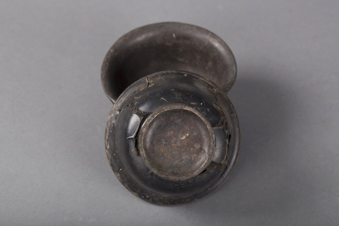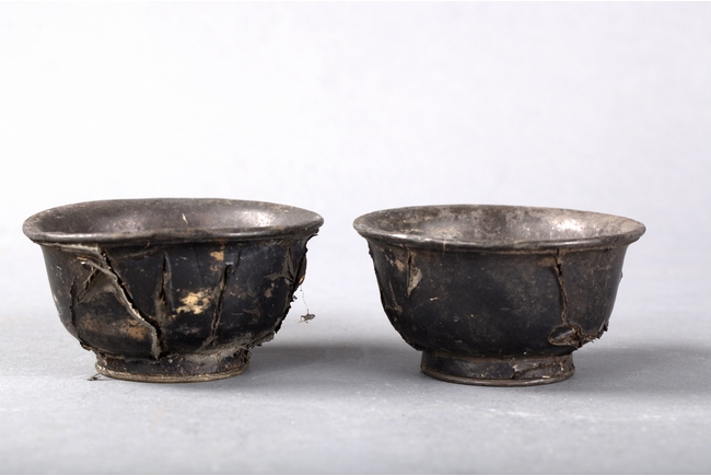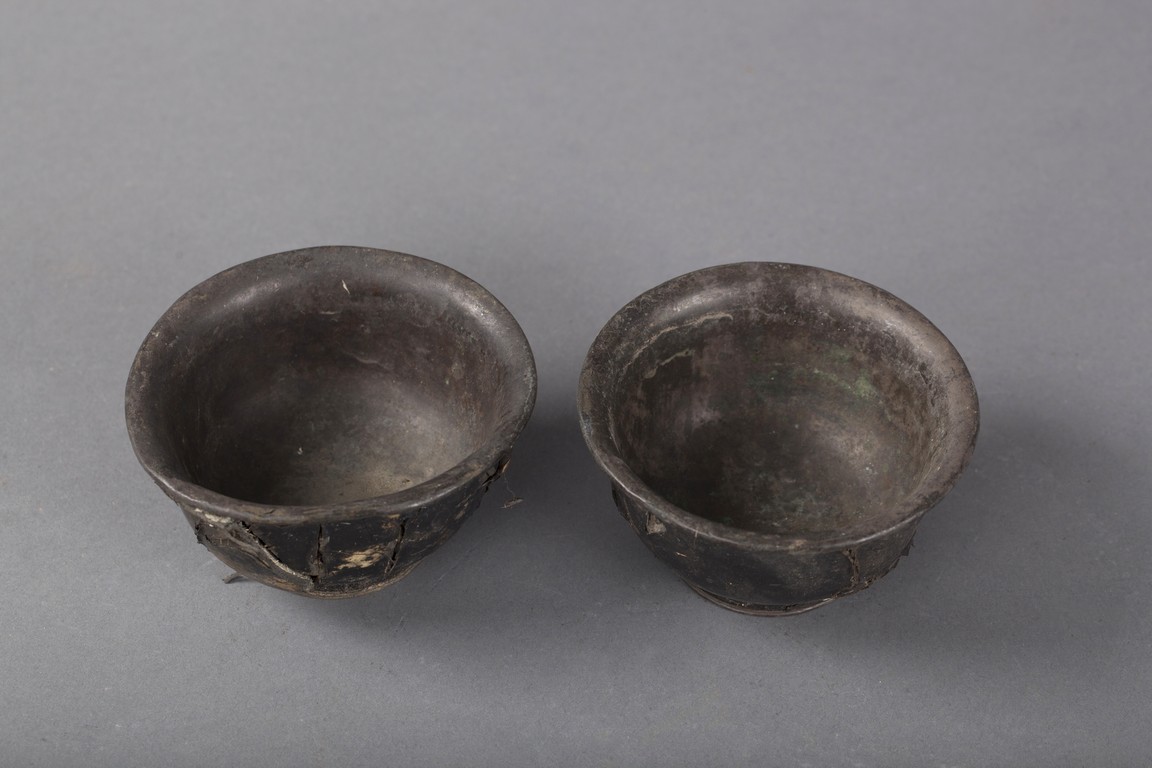 This pair of coconut bowls are round in the body and stands on a firm base. The rims slightly bulges out and many cracks are present on the sides.