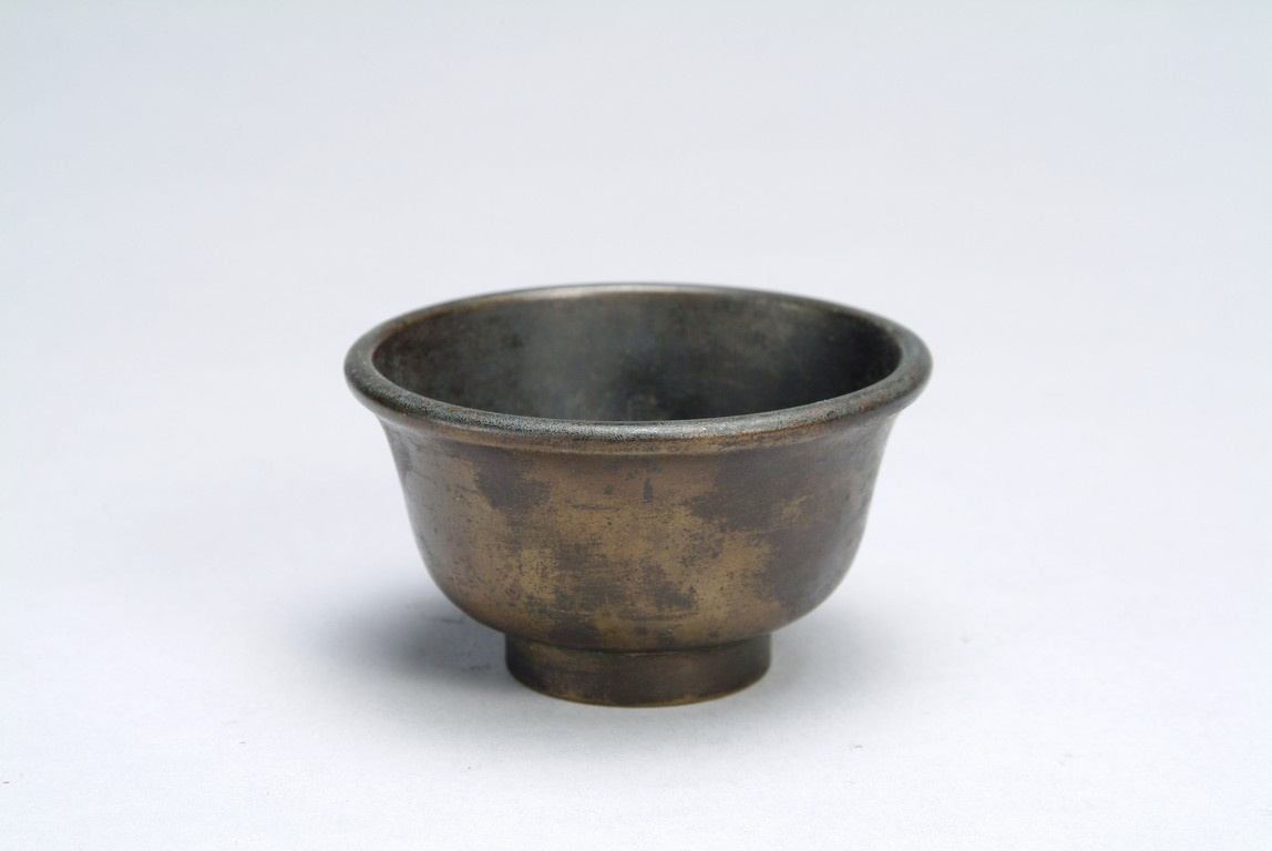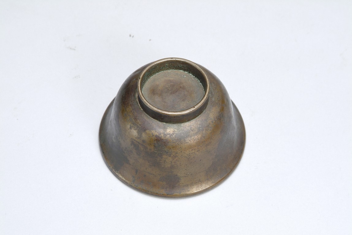 the sides of the bowl rise steeply to the rim with a larger opening. Notable discoloration in exterior and interior.