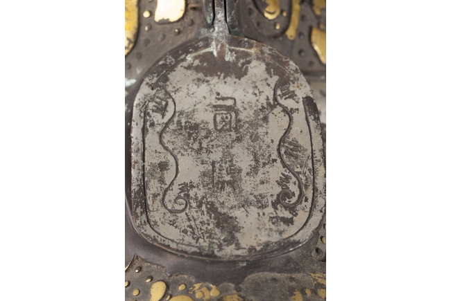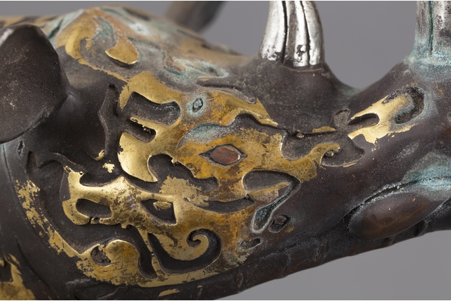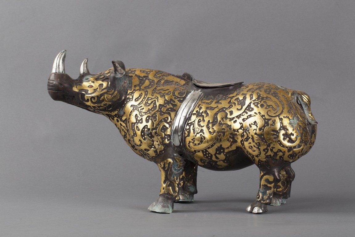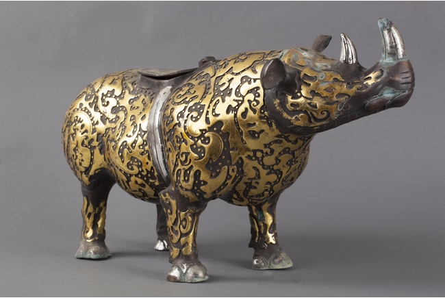 This bronze cast rhinoceros is gilt painted over the entire body with delicate patterns. The back has a cover that can be opened to reveal storage area.