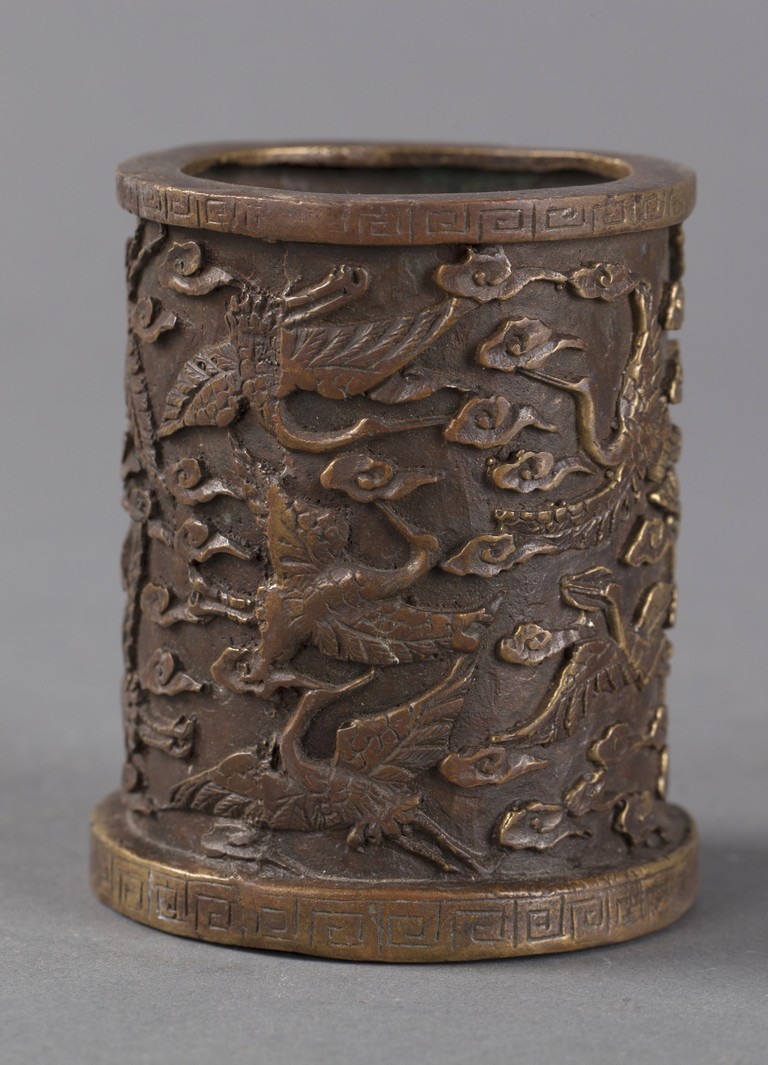 This beautifully carved crane brush-pot is made with bronze and is decorated with many flying cranes through the clouds. The top rim and bottom rim are decorated with leiwen patterns.