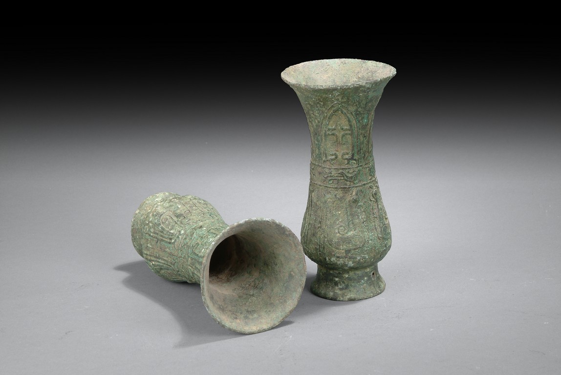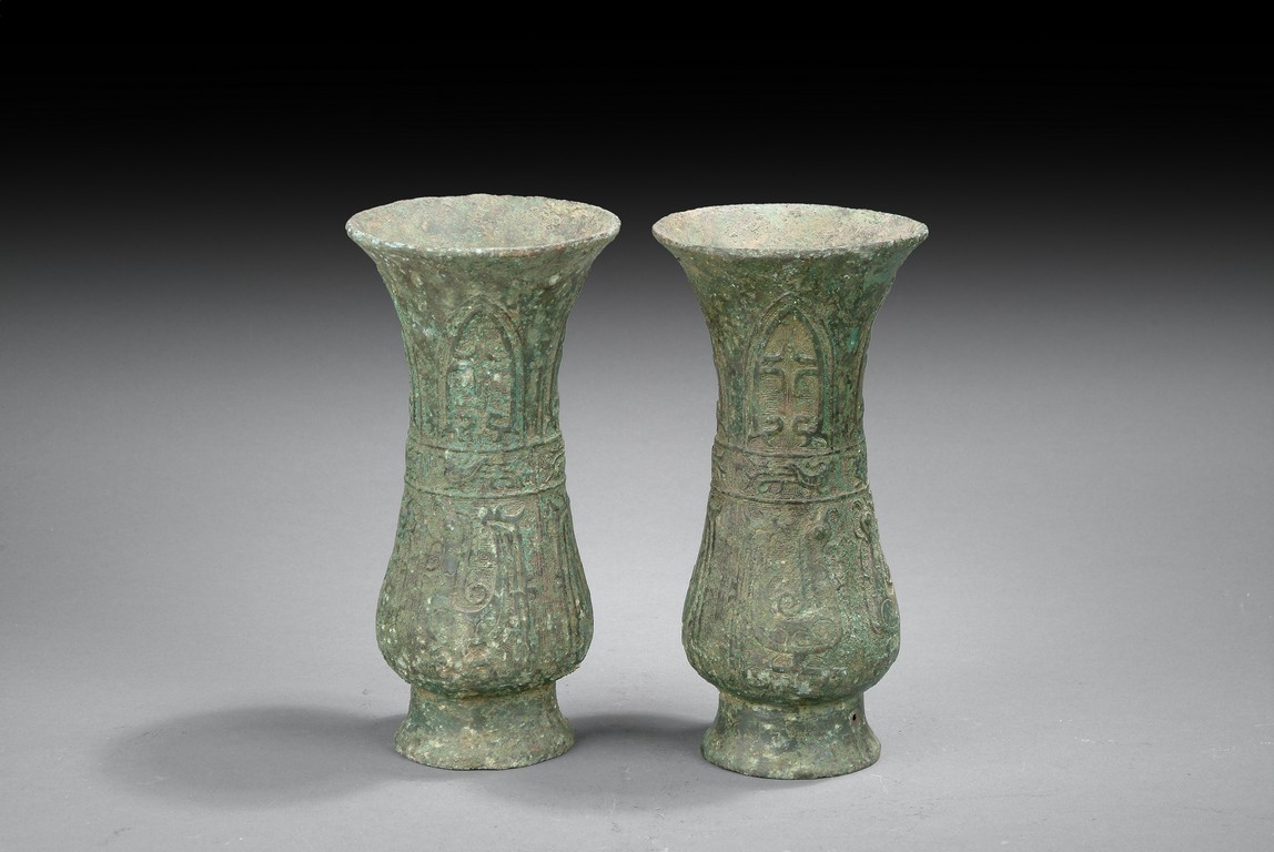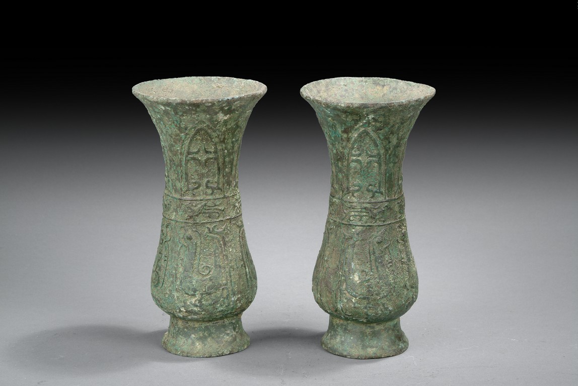 A PAIR OF ARCHAIC BRONZE 'PHOENIX' BOTTLES 西周 青銅雕雙鳳瓶一對