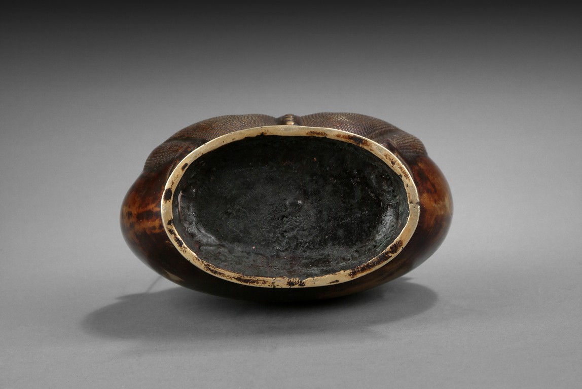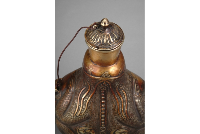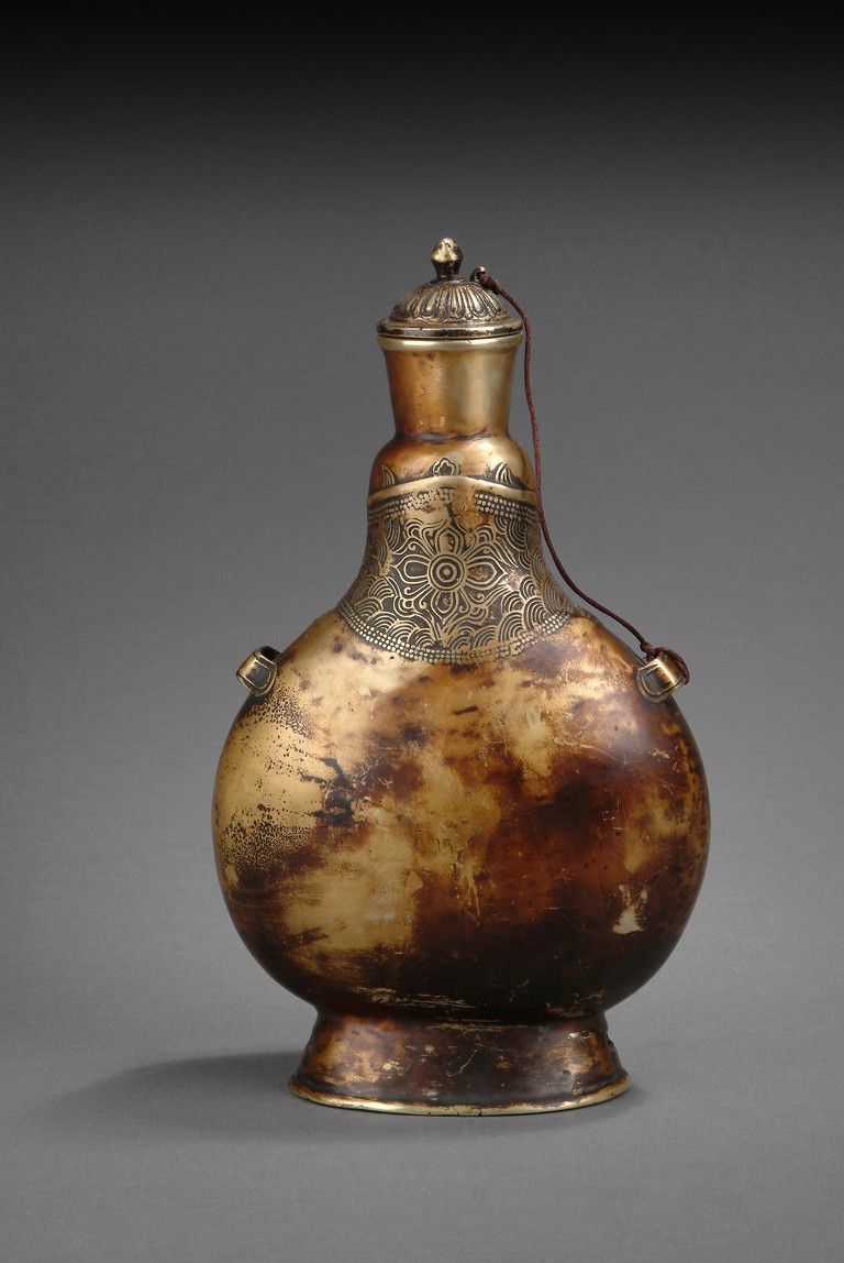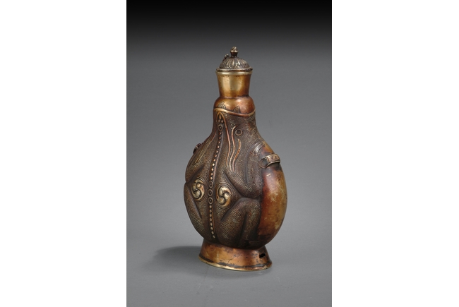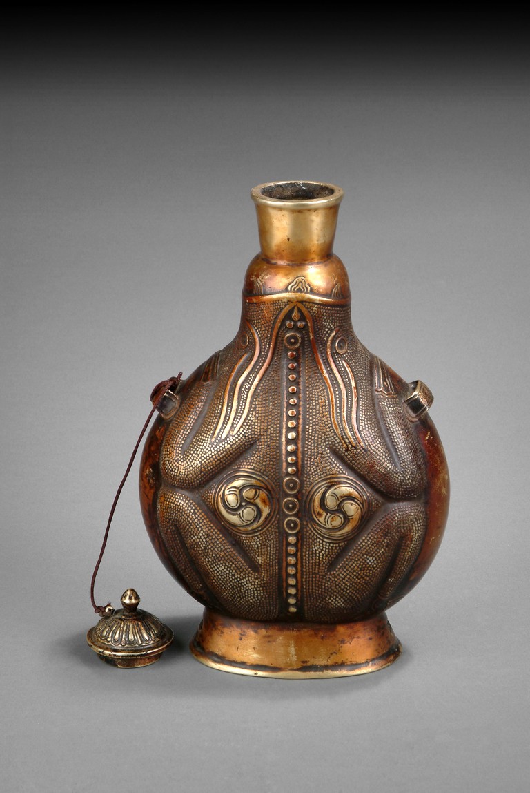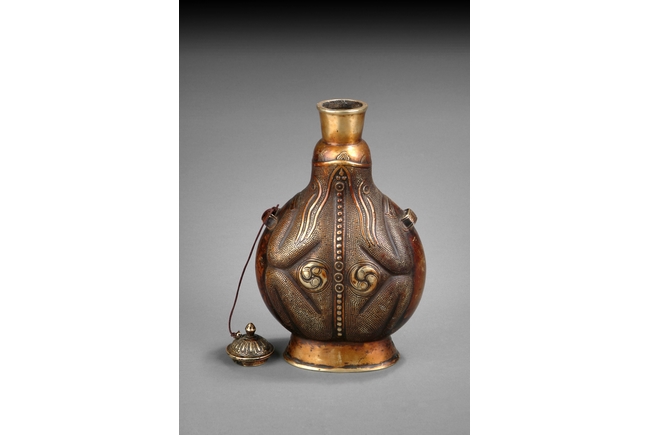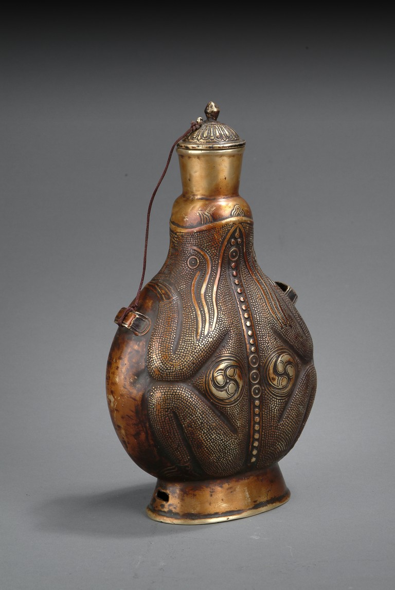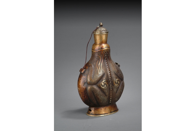 AN UNUSUAL CARVED BRONZE BOTTLE 十八/十九世紀 銅雕太極圖雙耳銅壺