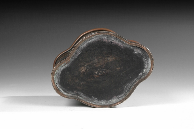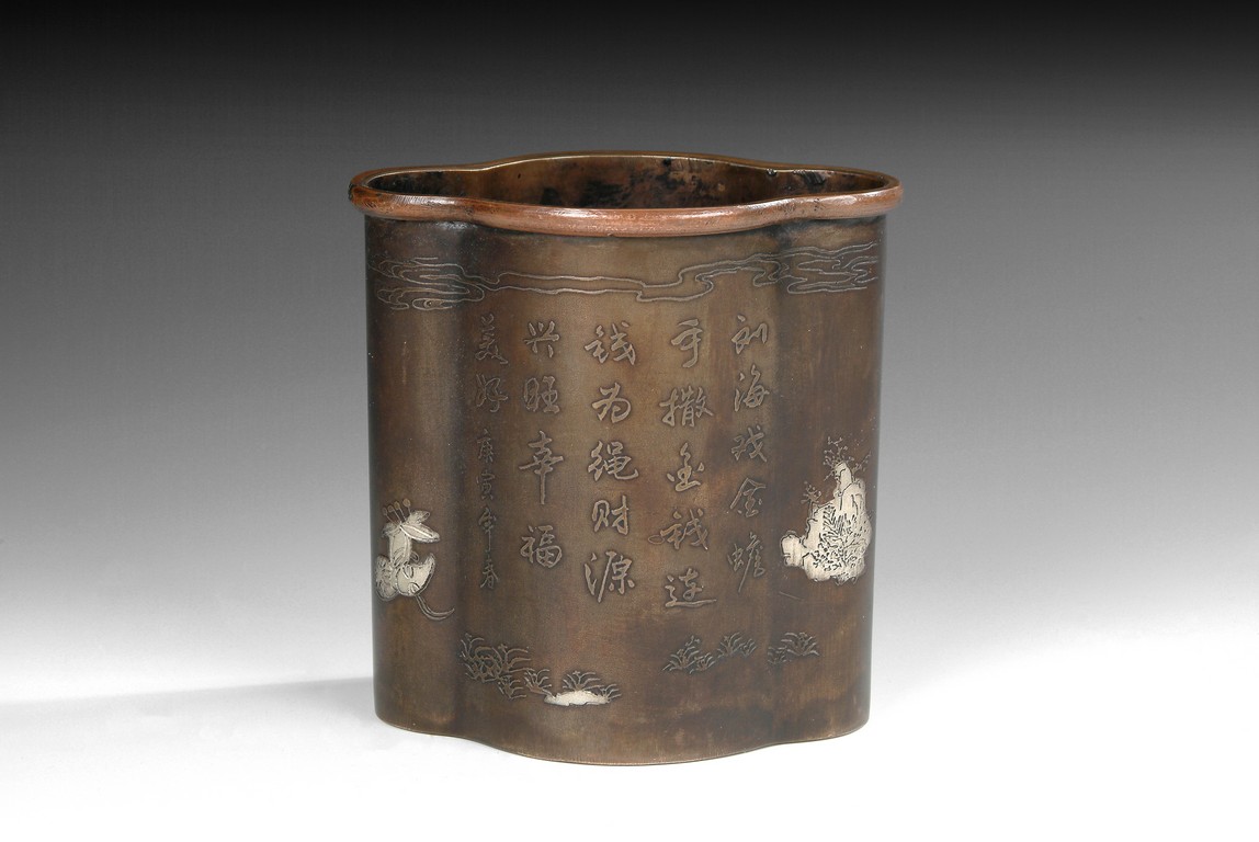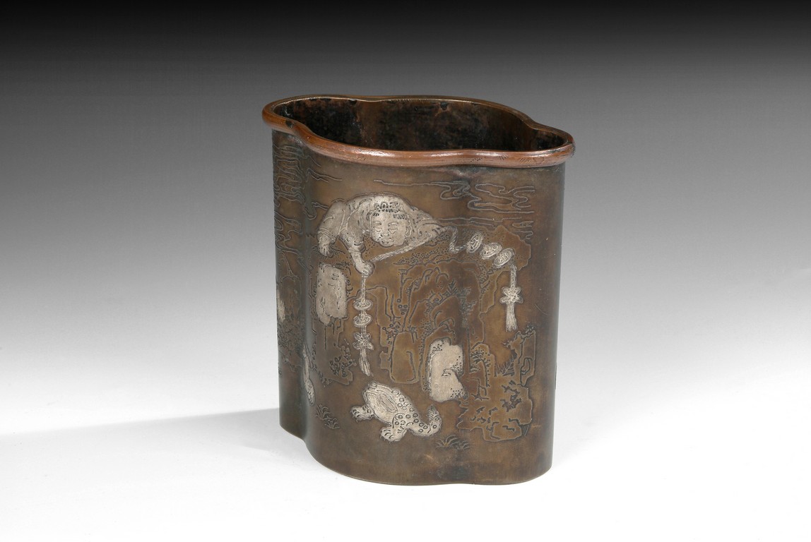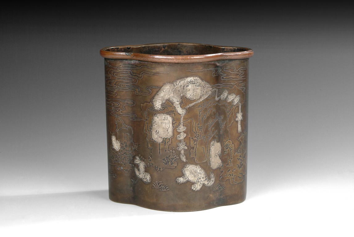 A SMALL TRIPOD CENSER 榮寶齋款 銅雕嵌銀劉海戲金蟾筆筒
