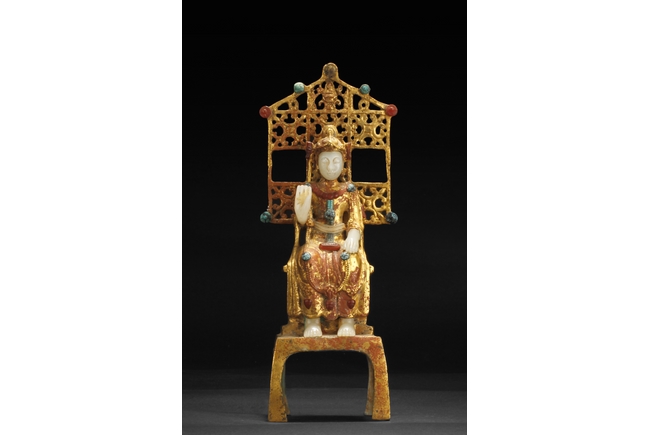 A Southern Asian style of gild jade inlaid "Guanyin" seated in her throne chair.