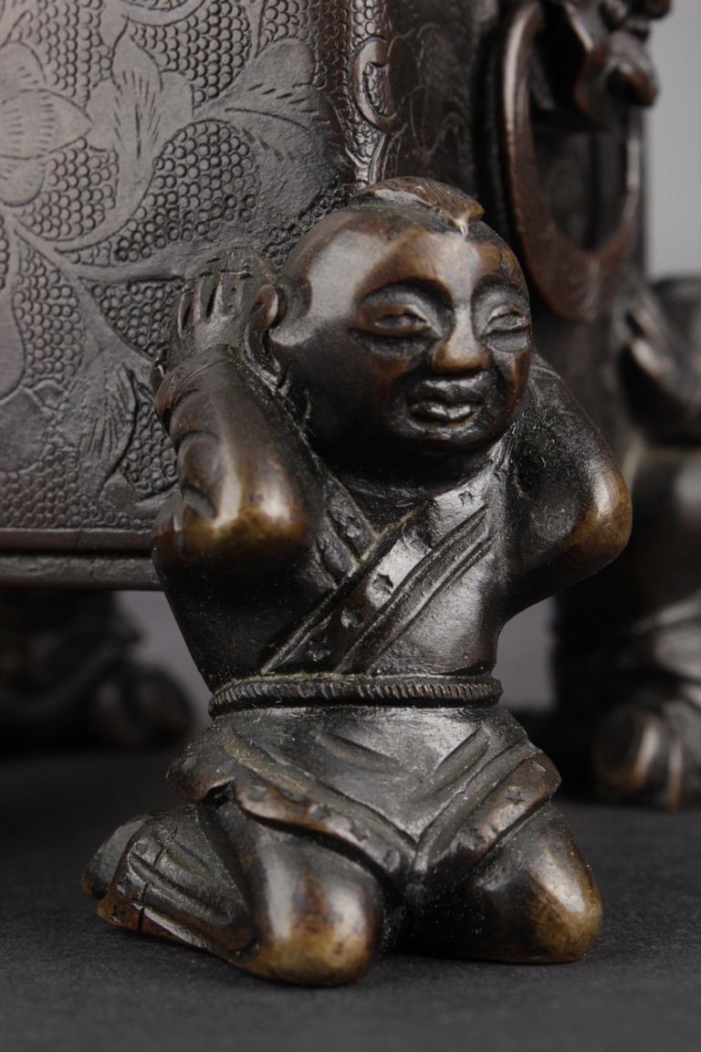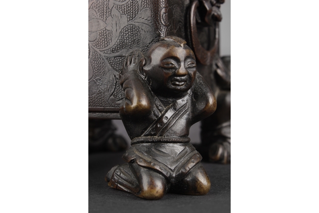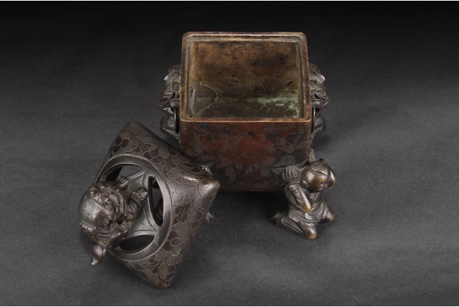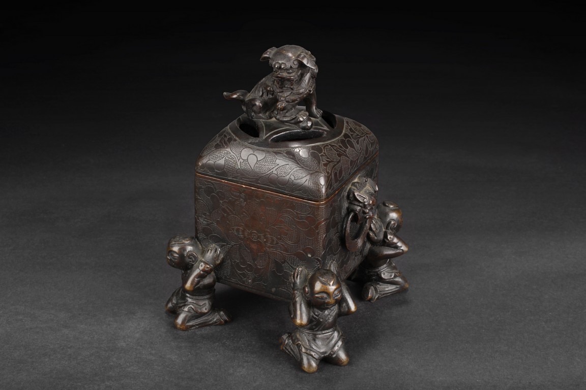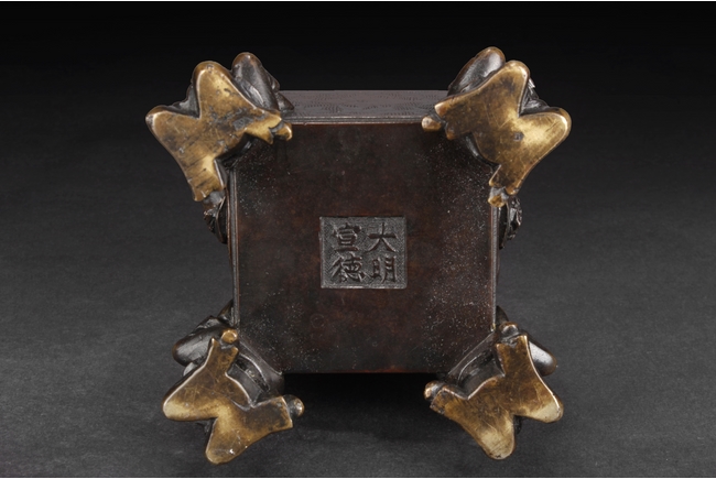 A BRONZE FOUR-LEG TWO-HANDLED SQUARE CENSER 大明宣德銅制四足雙耳約絲香爐