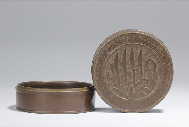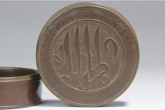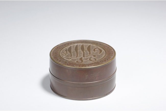 A cylindrical shaped box with key-fret pattern and Arabic symbols.