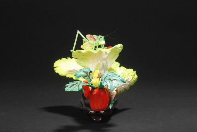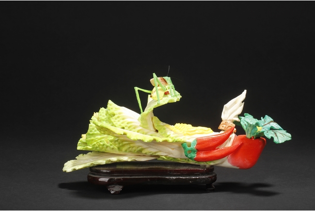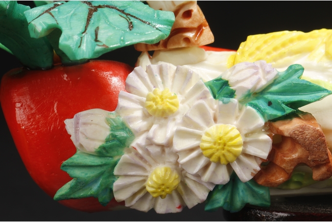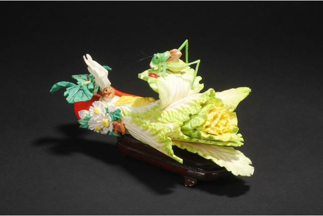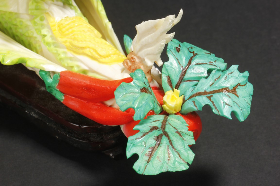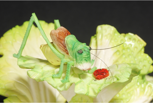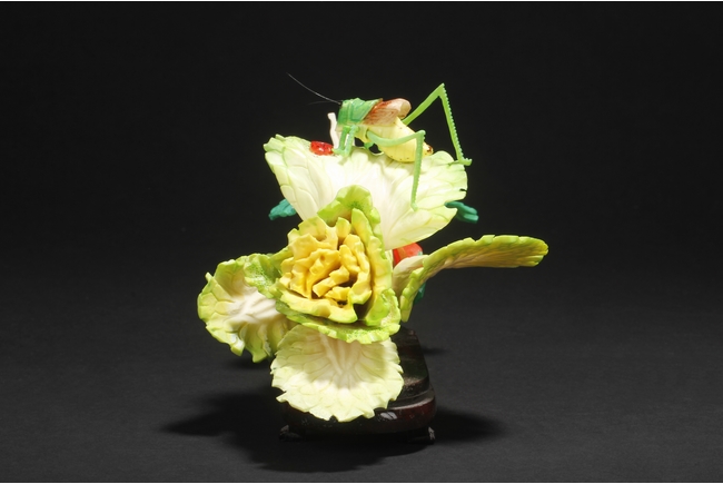 A bone cabbage with a carved ladybug and a cricket on it; the cricket has two long feelers; a radish