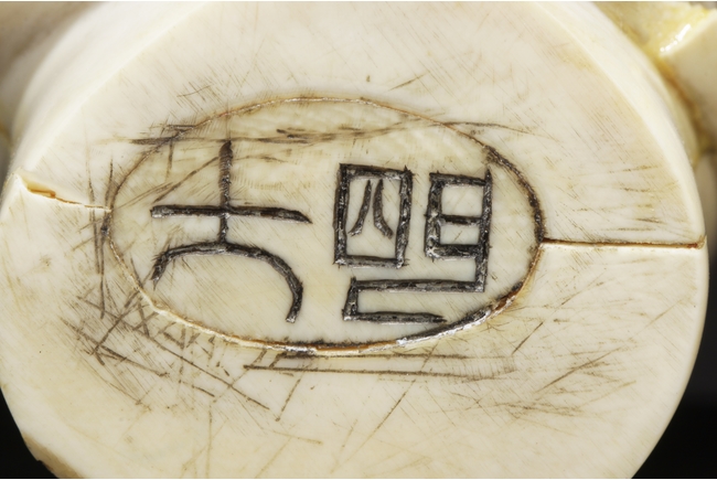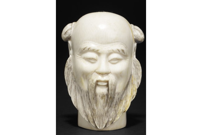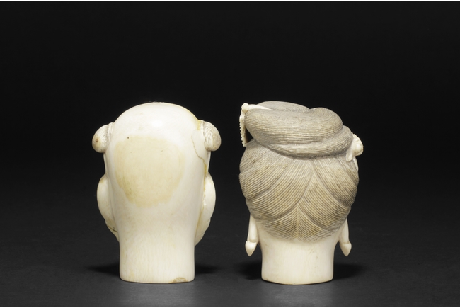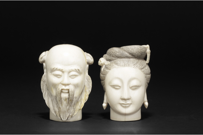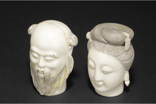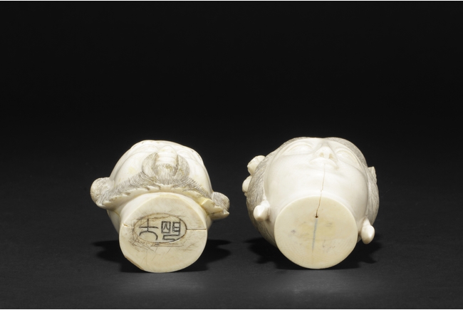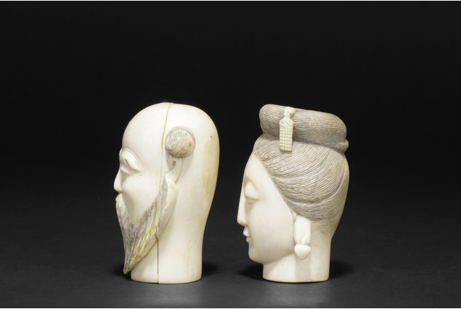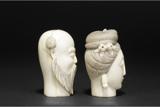 hair ornaments and earrings. The other carved figure depicts a bearded man with two characters carved on the bottom.
