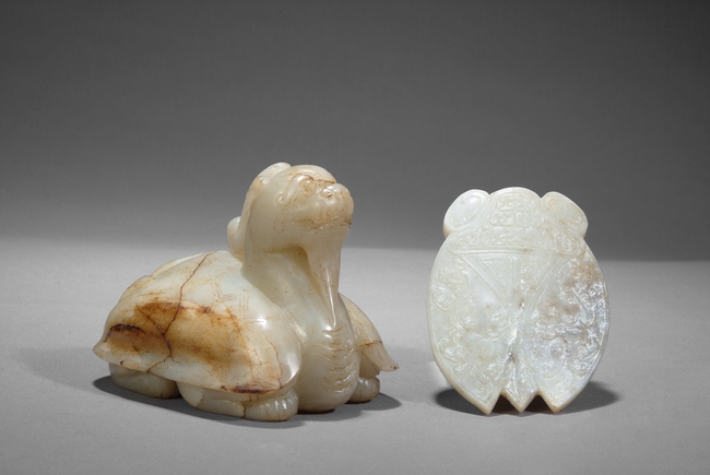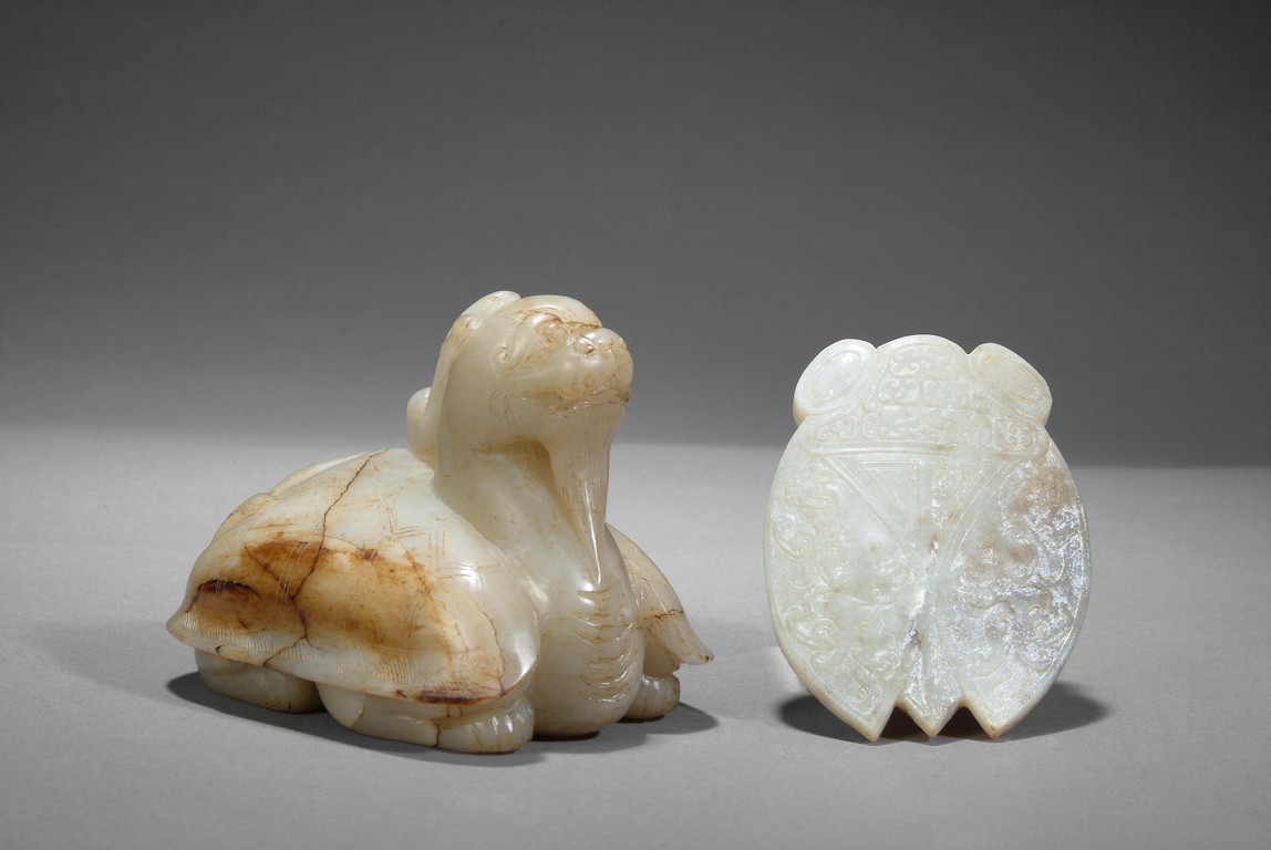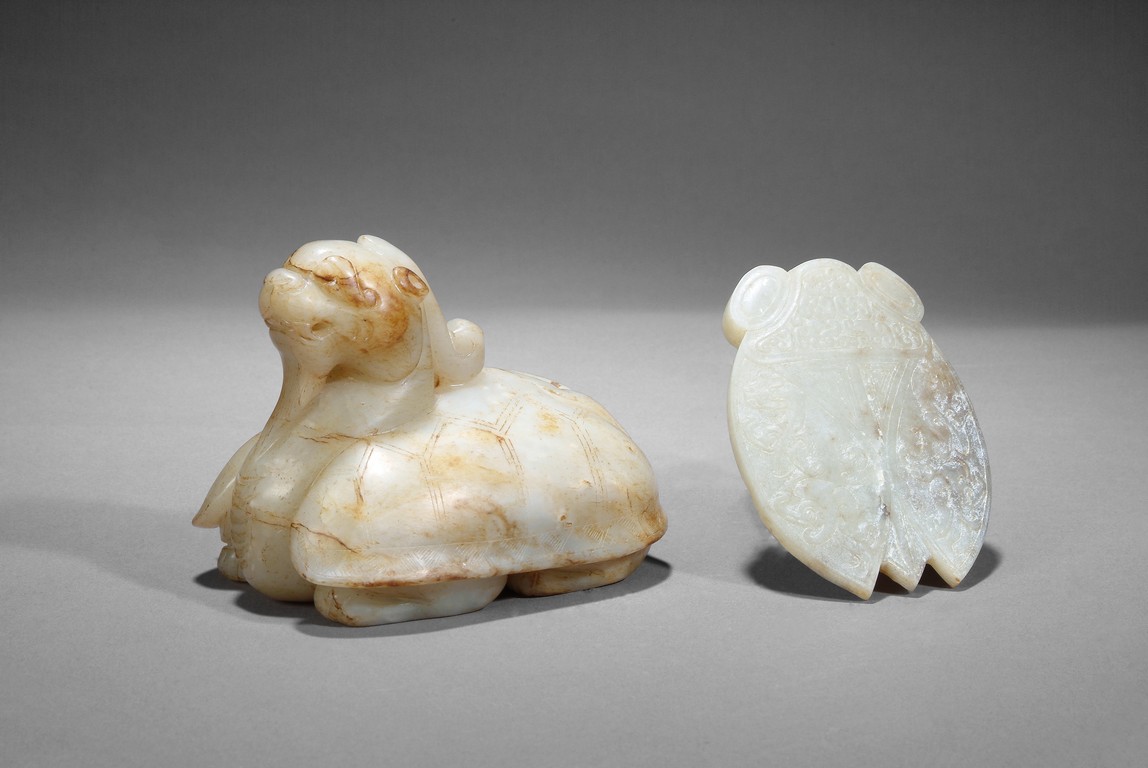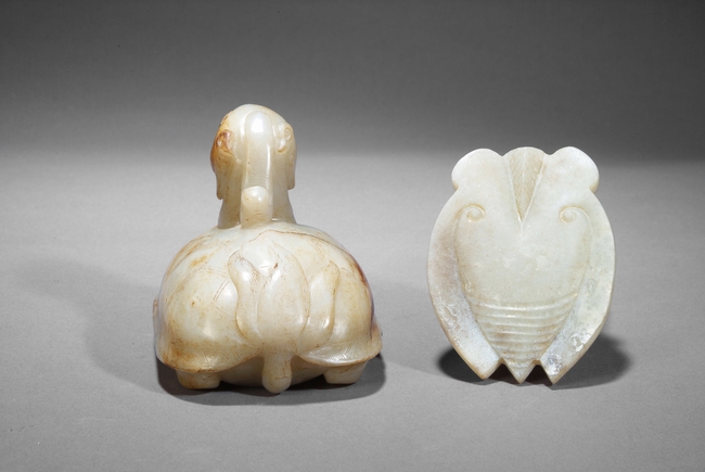 one of a cicada and the other of a turtle. The turtle is of celadon tone with russet inclusions and cicada is of pale celadon tone.