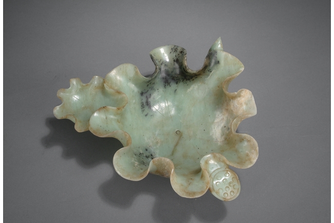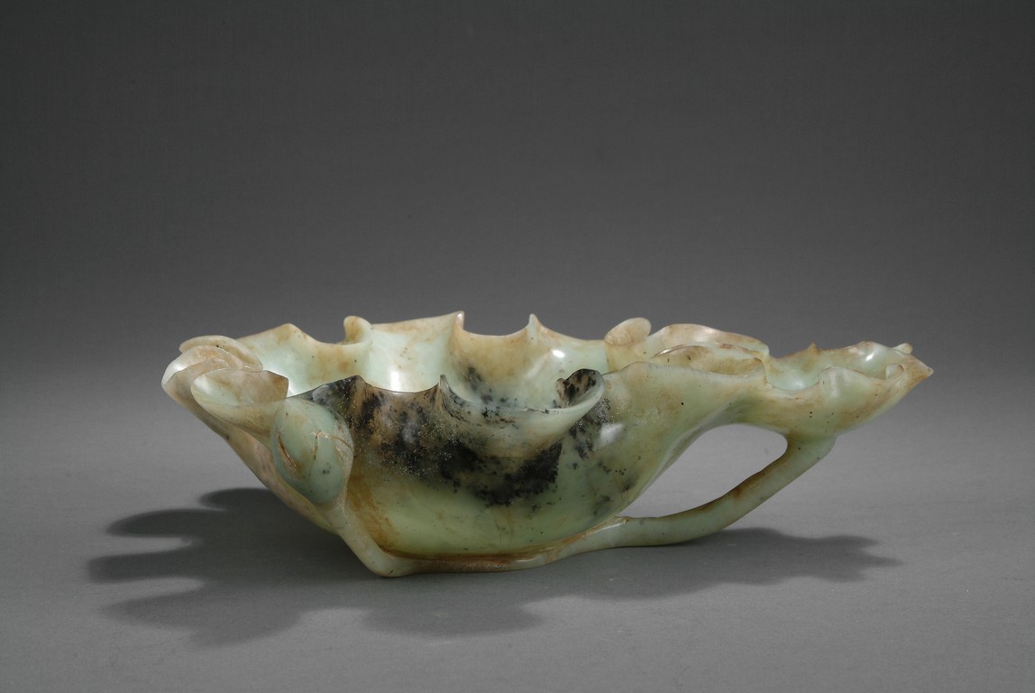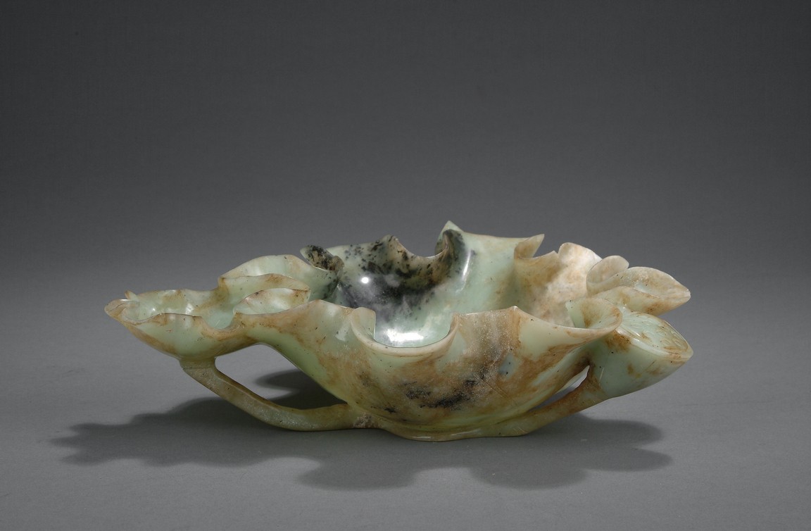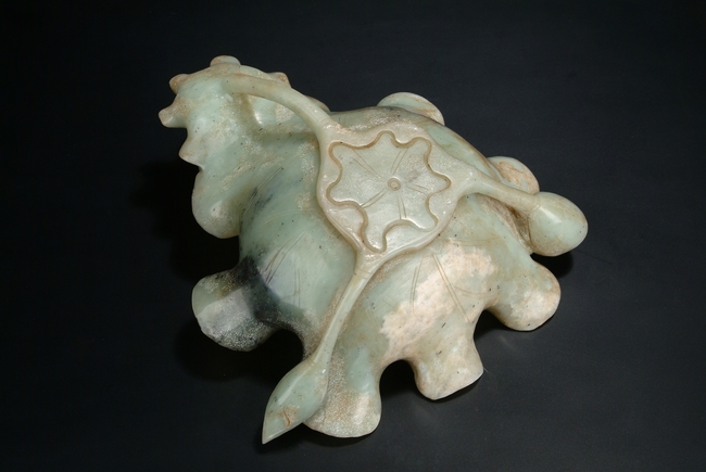 the well carved stone has two lotus leaf receptacles with base supporting the leaf with carved pod and stems. The stone is of pale grey-green color with dark green speckling and some opaque white mottling. Qing Dynasty period.
