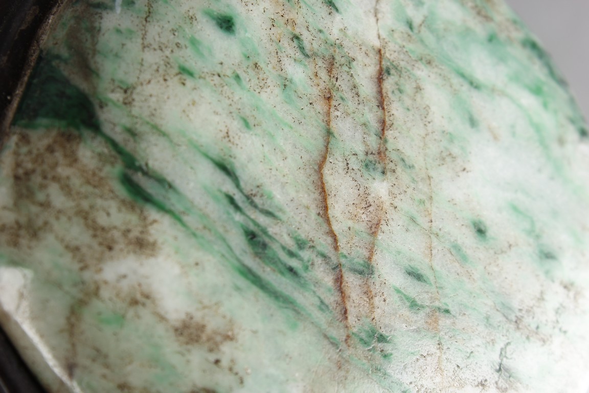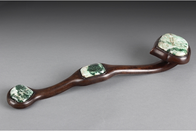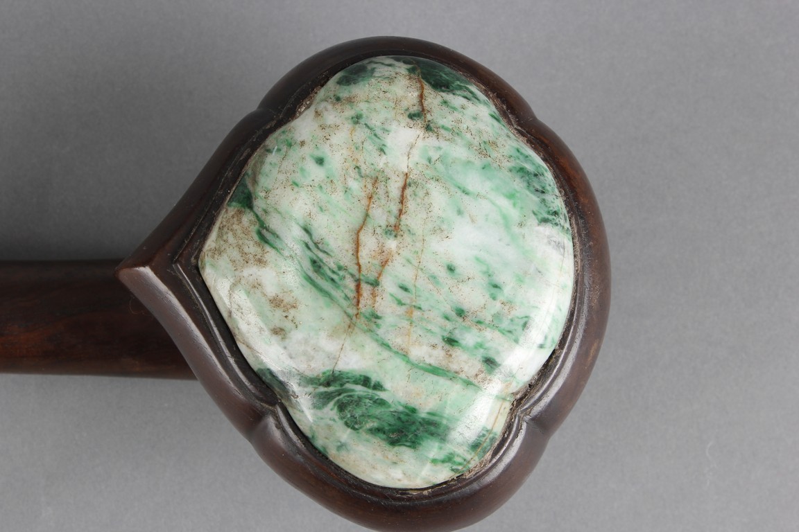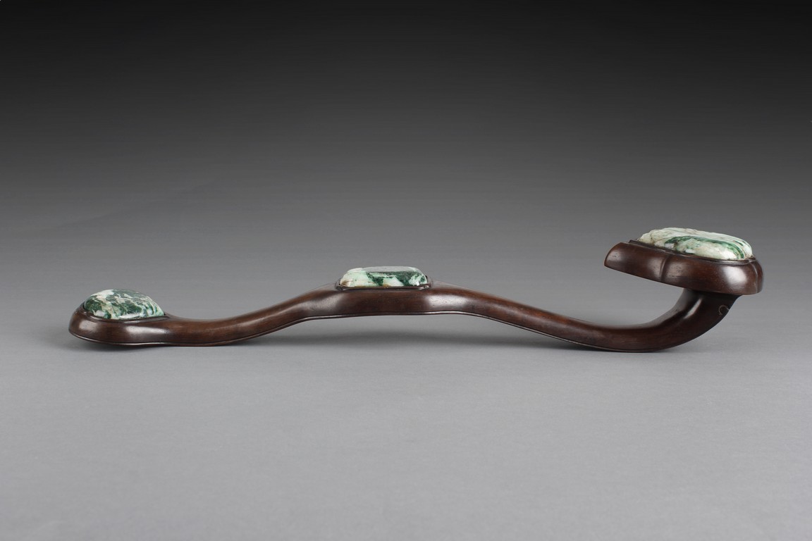 A ZITAN RUYI DECORATED WITH JADE 十九世紀 紫檀木鑲墨玉雕如意