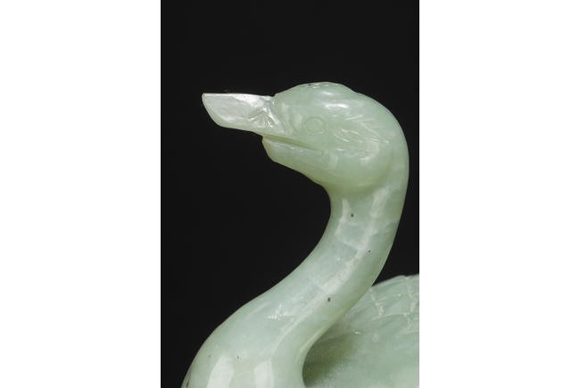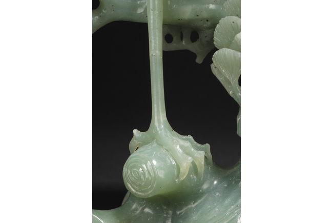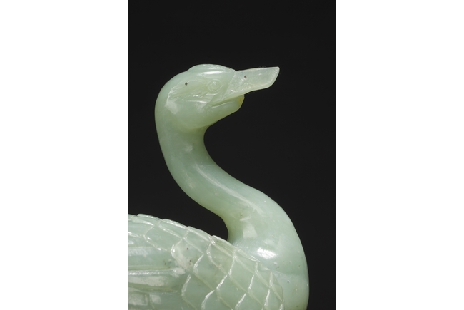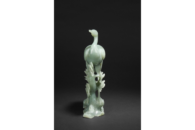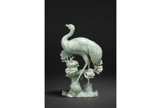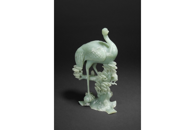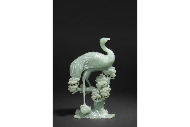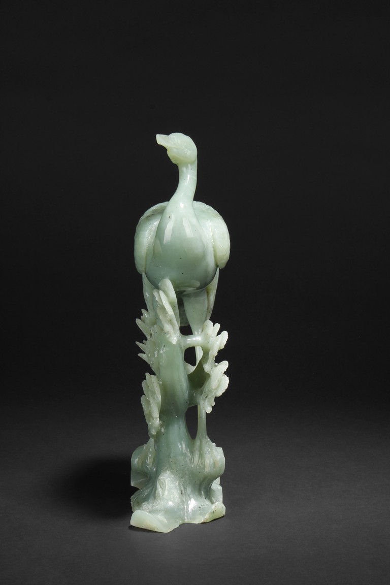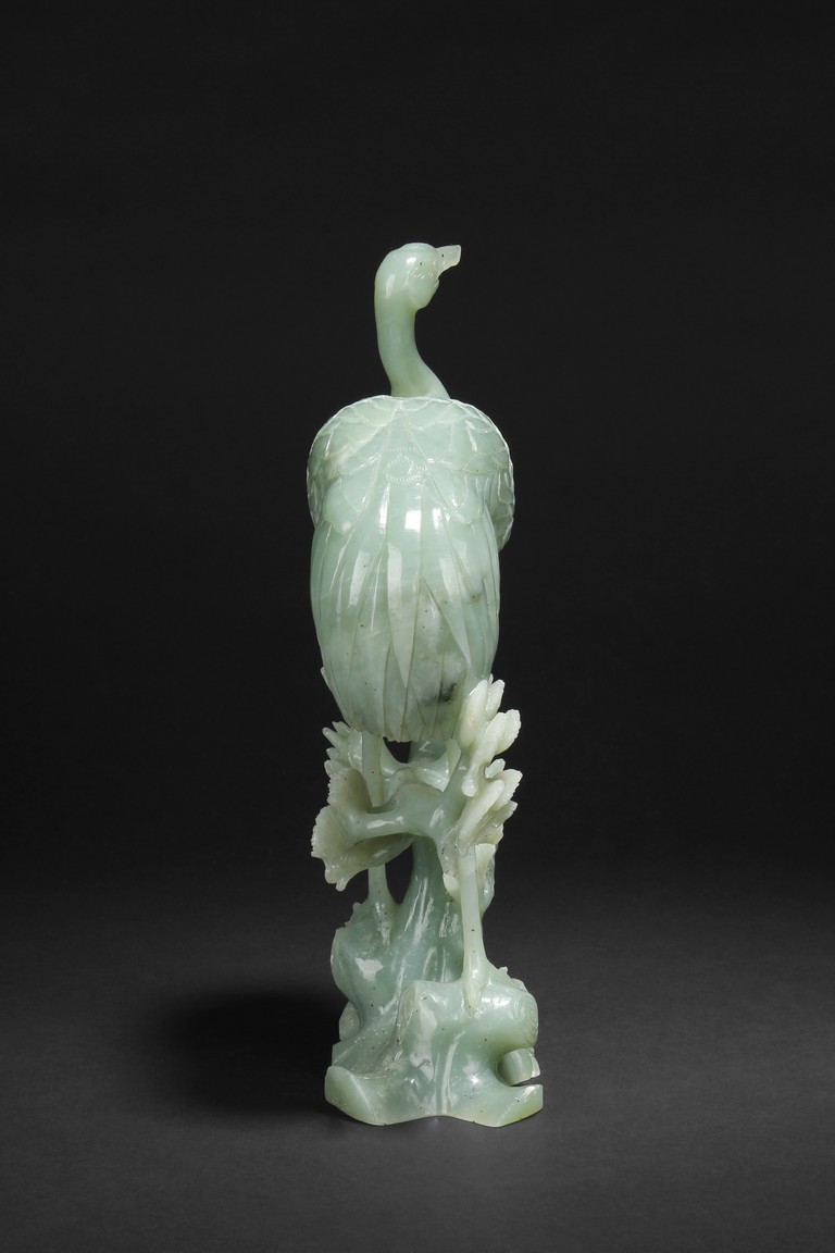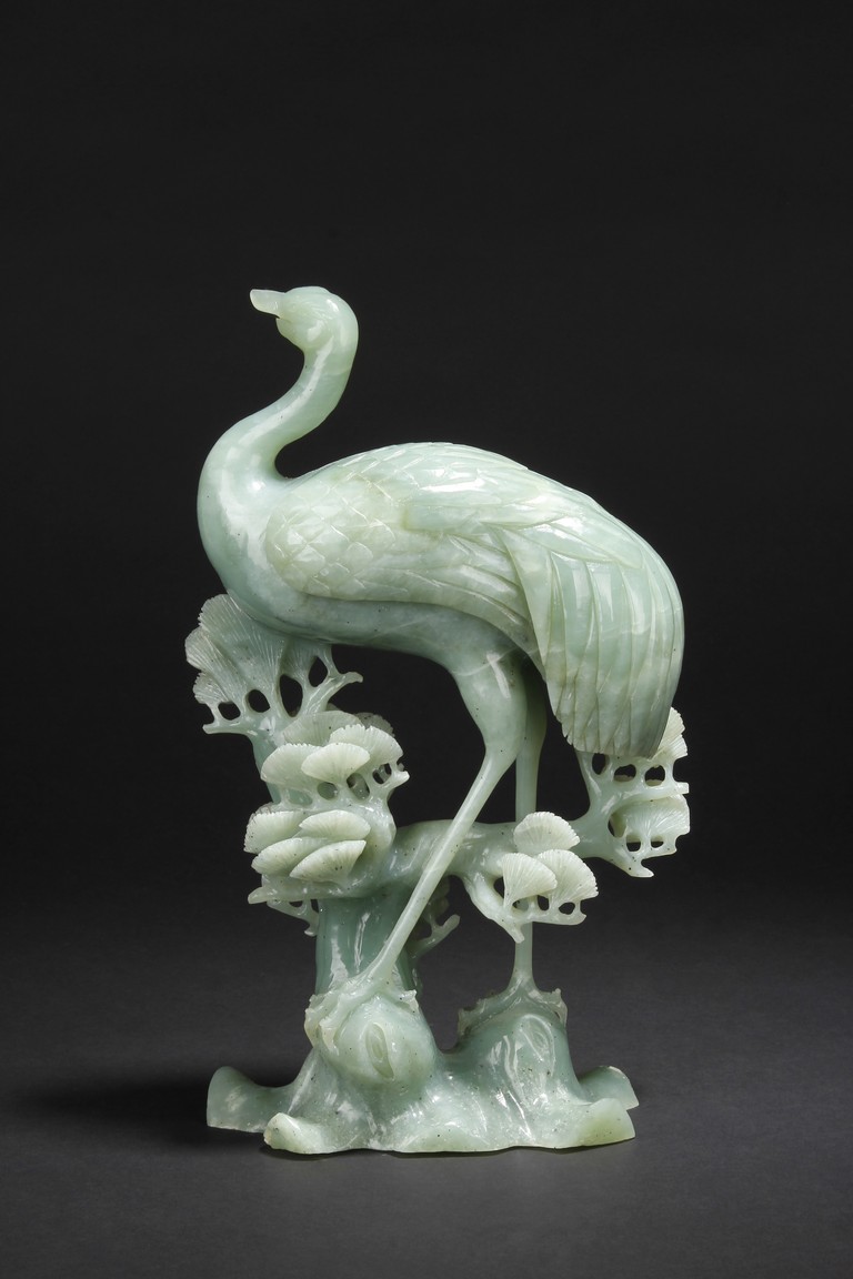 A fine piece jade carving of a crane standing over a pine tree branch