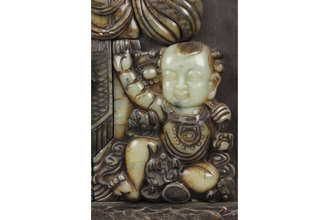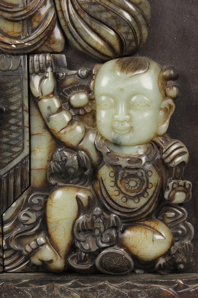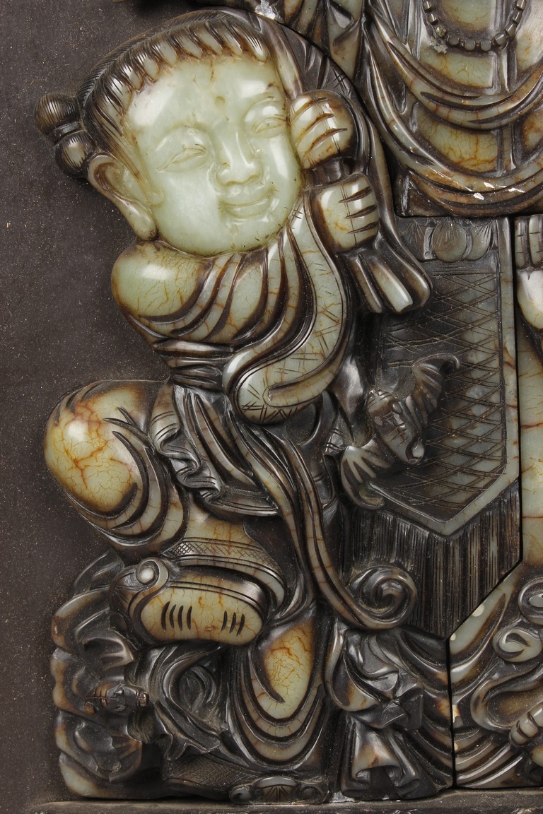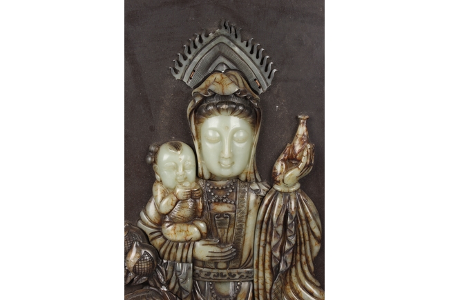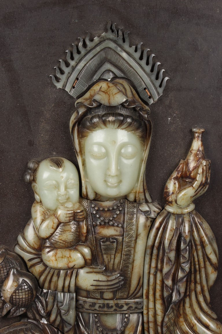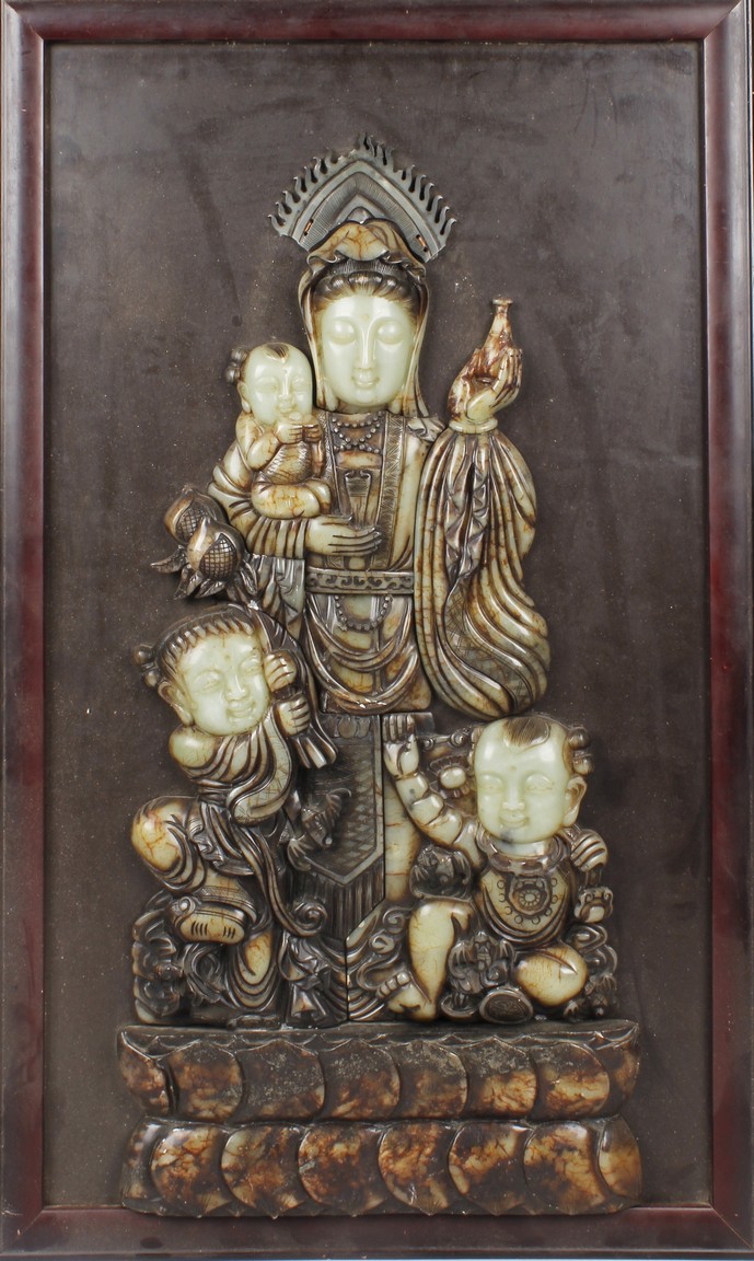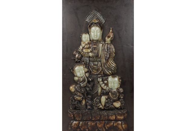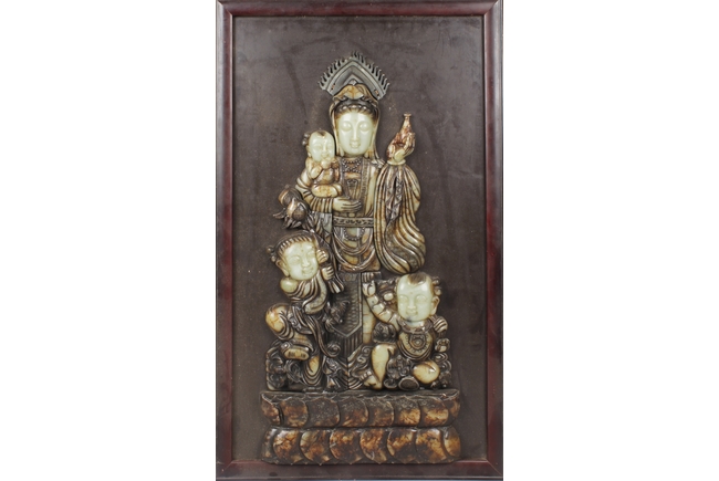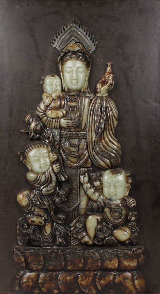 "Hanging screen inlaid with finely carved jade in the image of "Guanyin" holding a baby on her right arm with two children gathered around her.