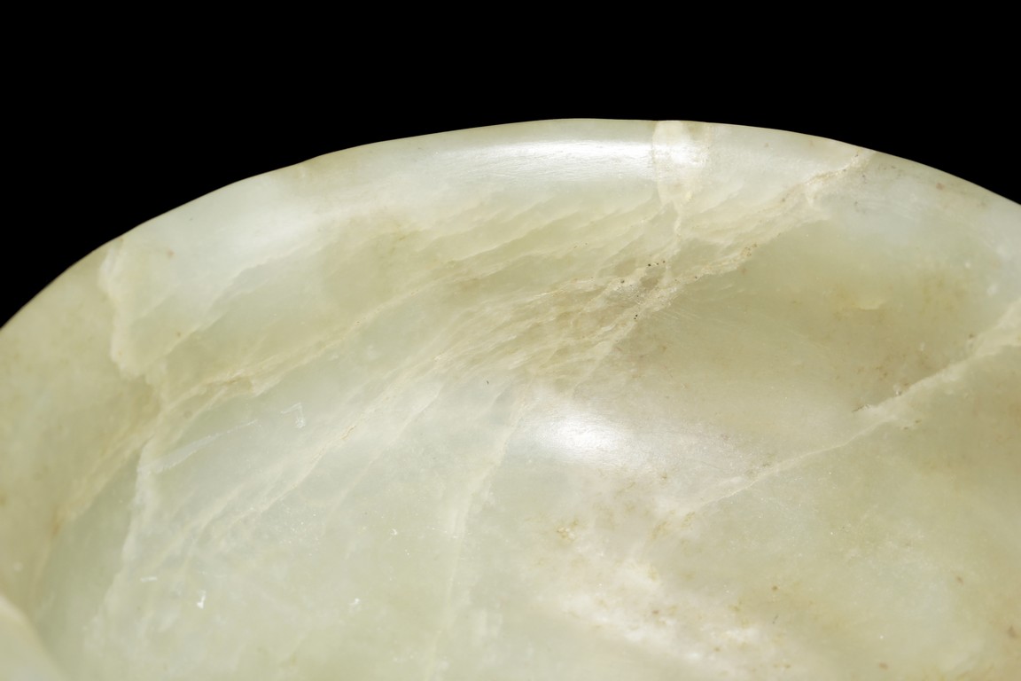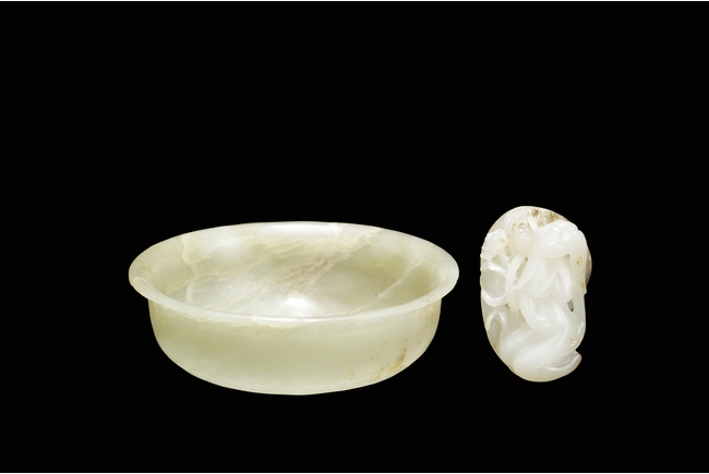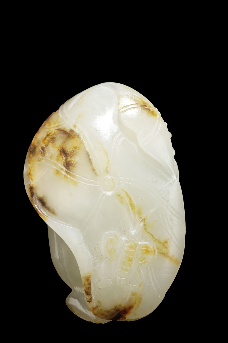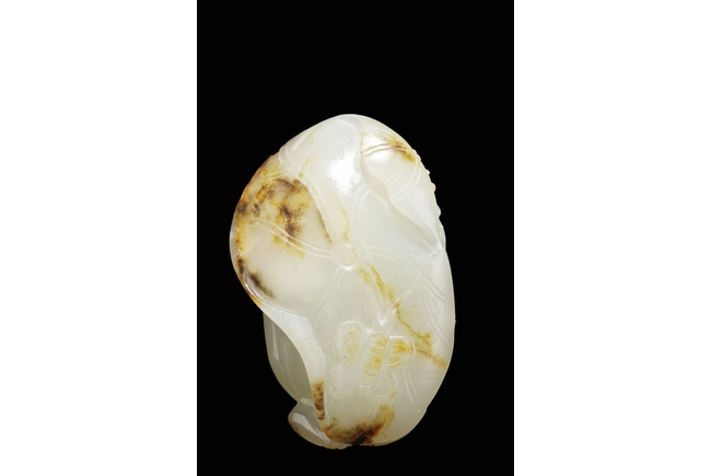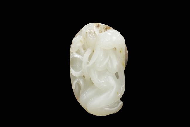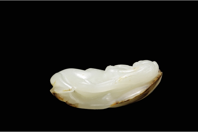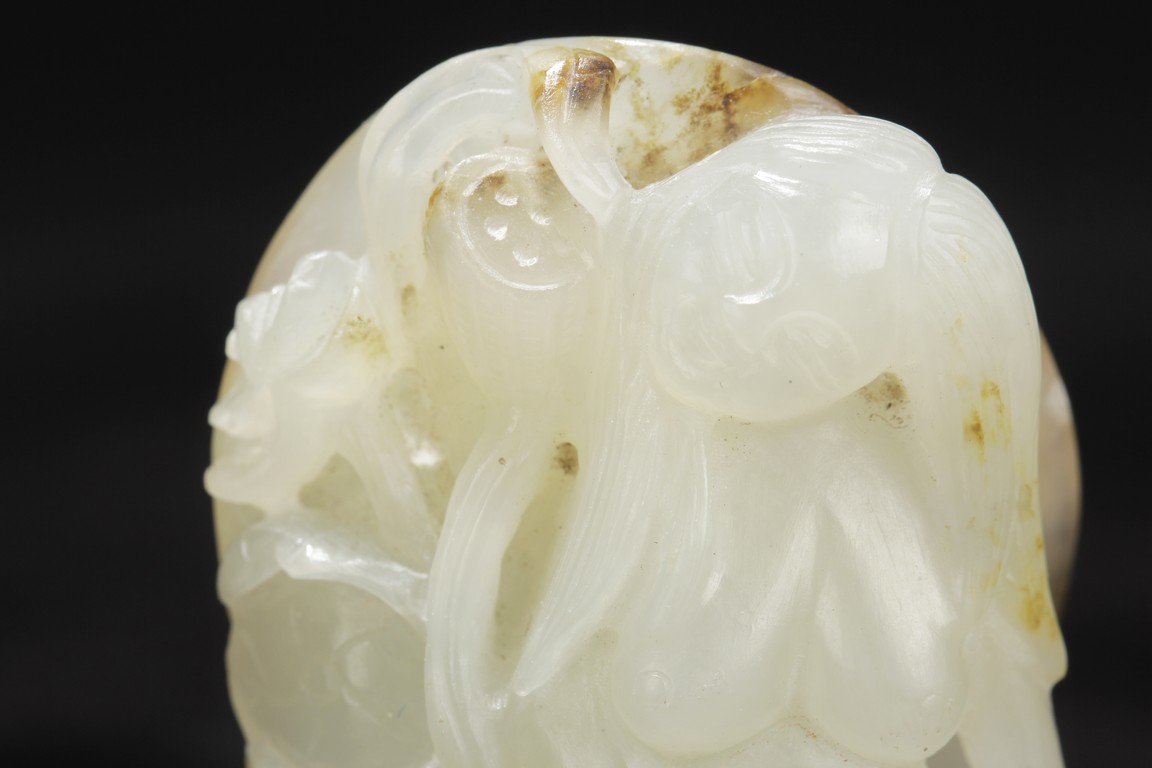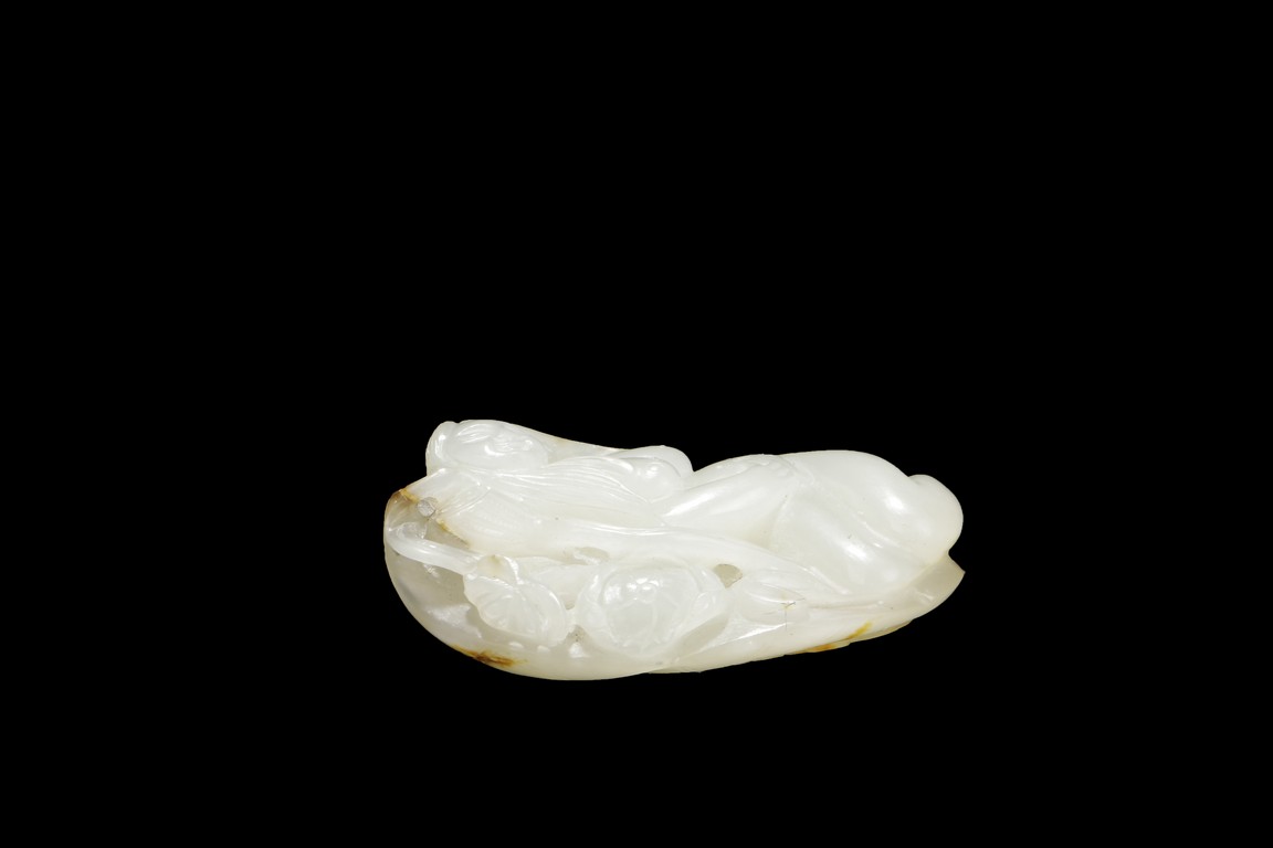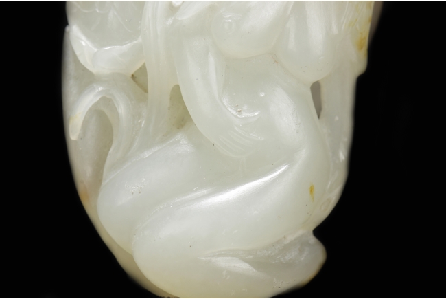 "The jade ornament is carved with a bare lady resting on top of lotus leaf near lotus flowers