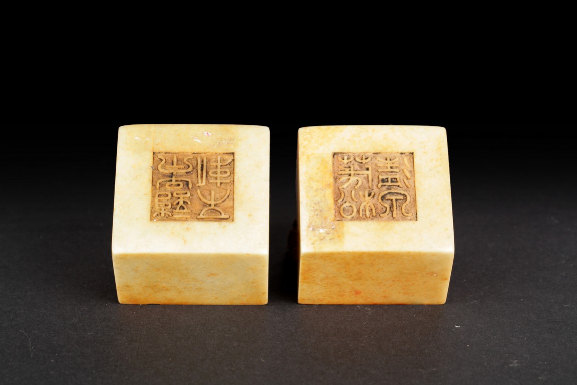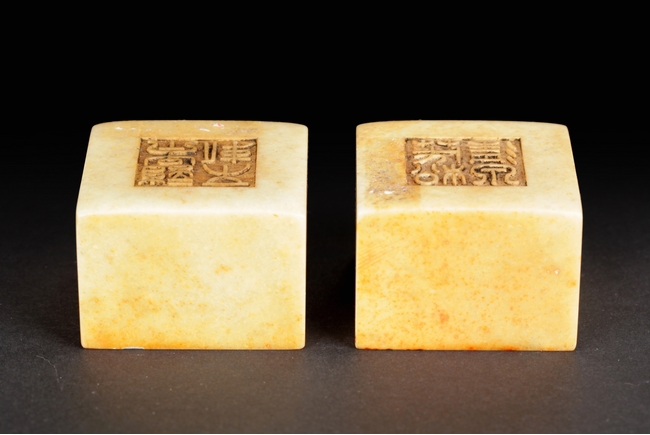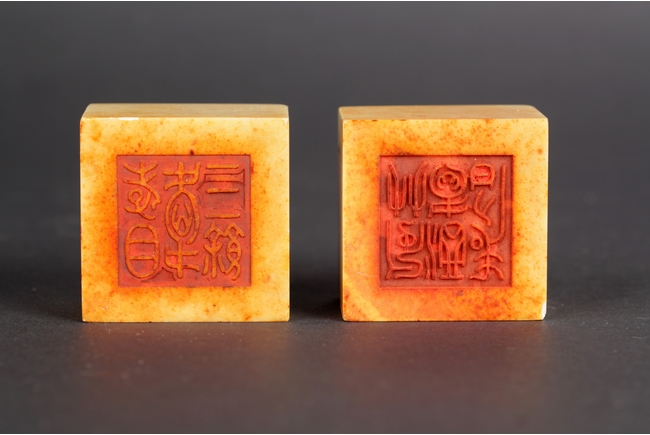 the two seals with different four character marks on top and bottom with slight russet over mostly yellow stone.