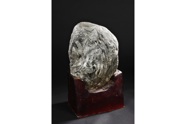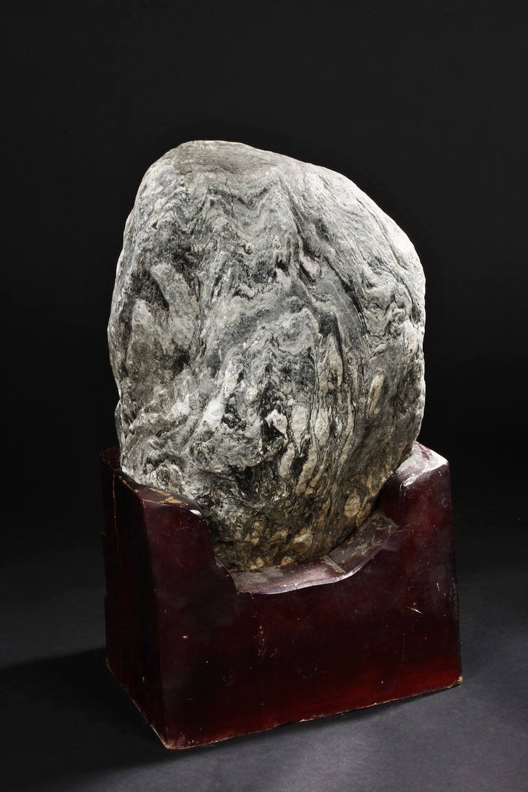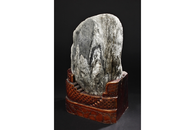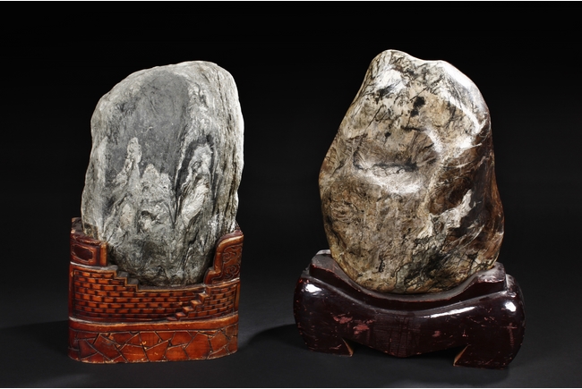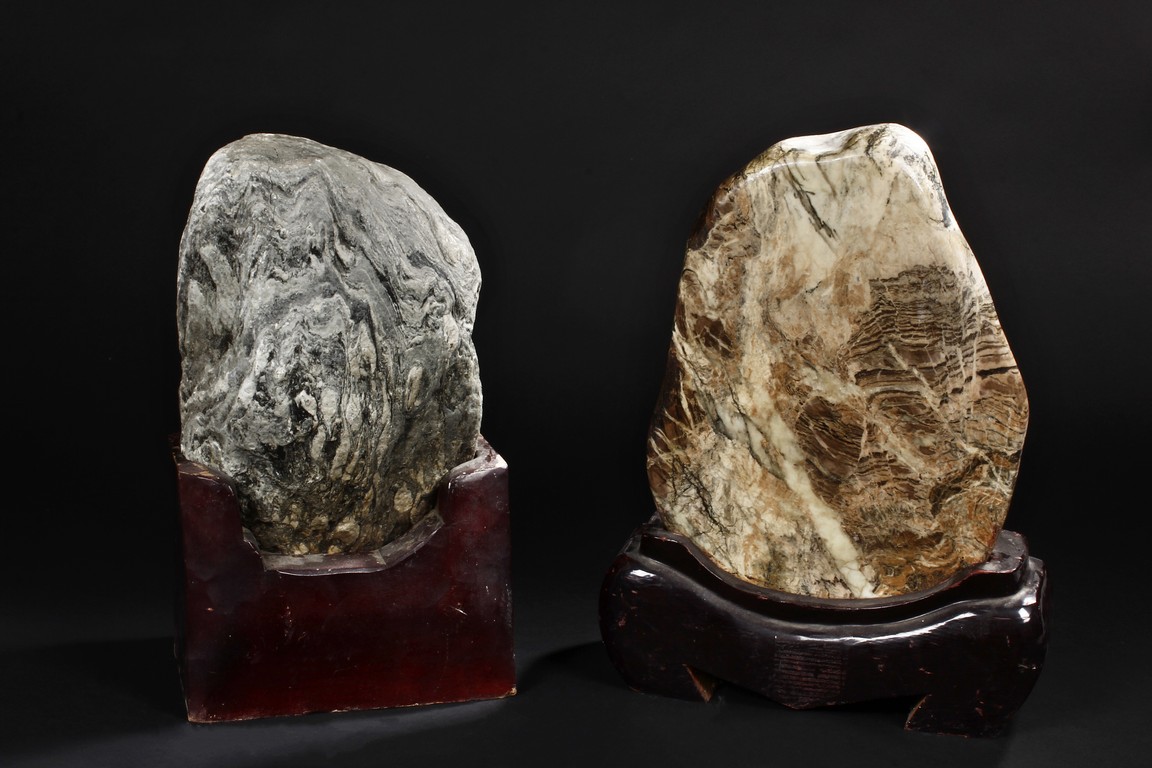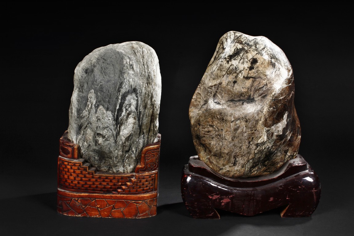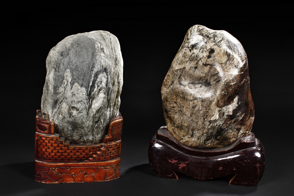 TWO NATURAL STONE BOULDERS WITH STANDS 石山子連坐 (兩個)