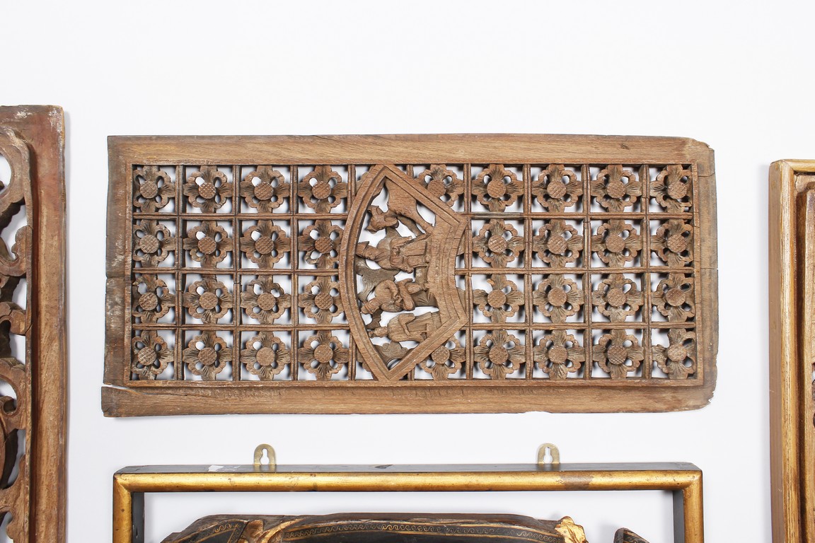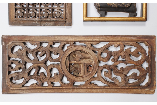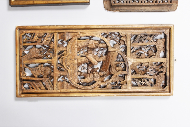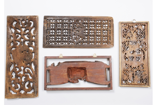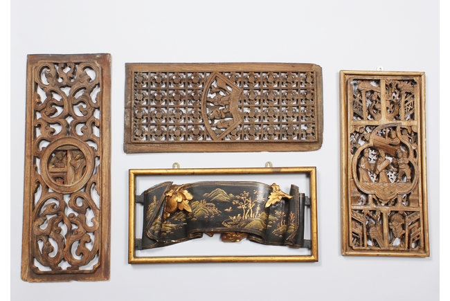 FOUR PIECES OF WOODEN DECORATION 木框江南圖樹葉裝飾 (左下角有裂痕)