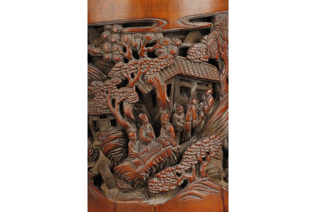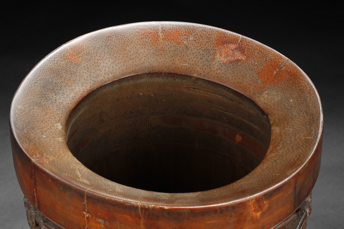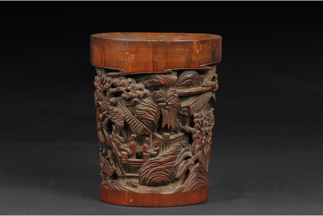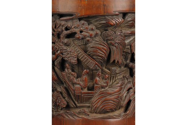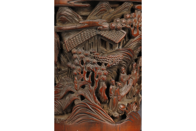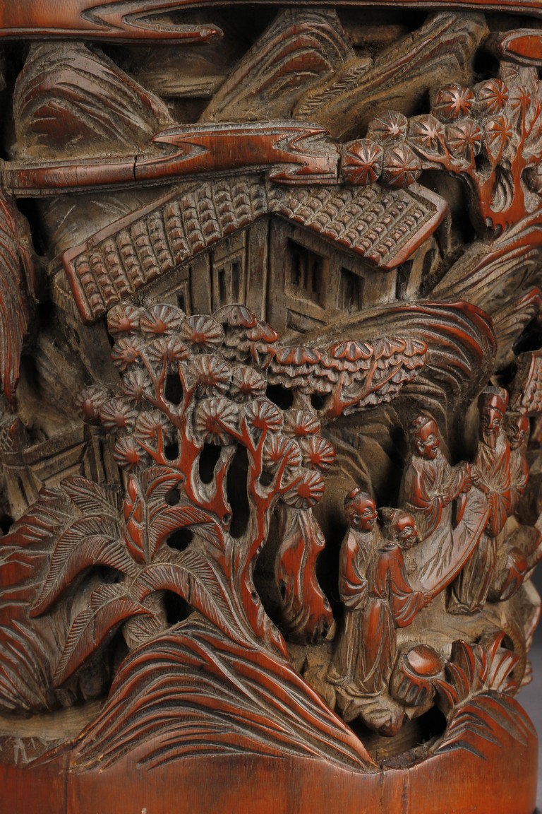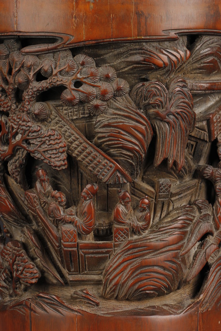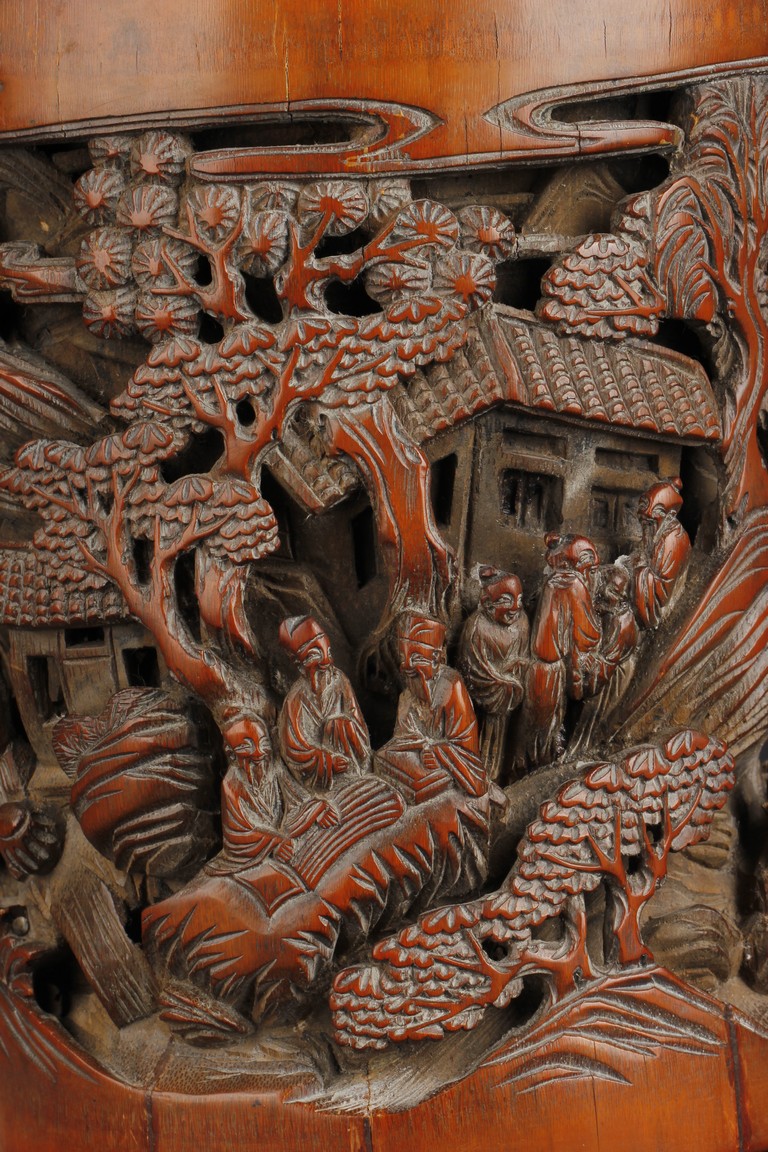 A PIERCE CARVED BAMBOO BRUSH POT 十九世紀 鏤空竹雕'眾翁會友'筆筒