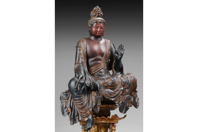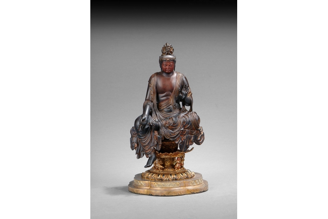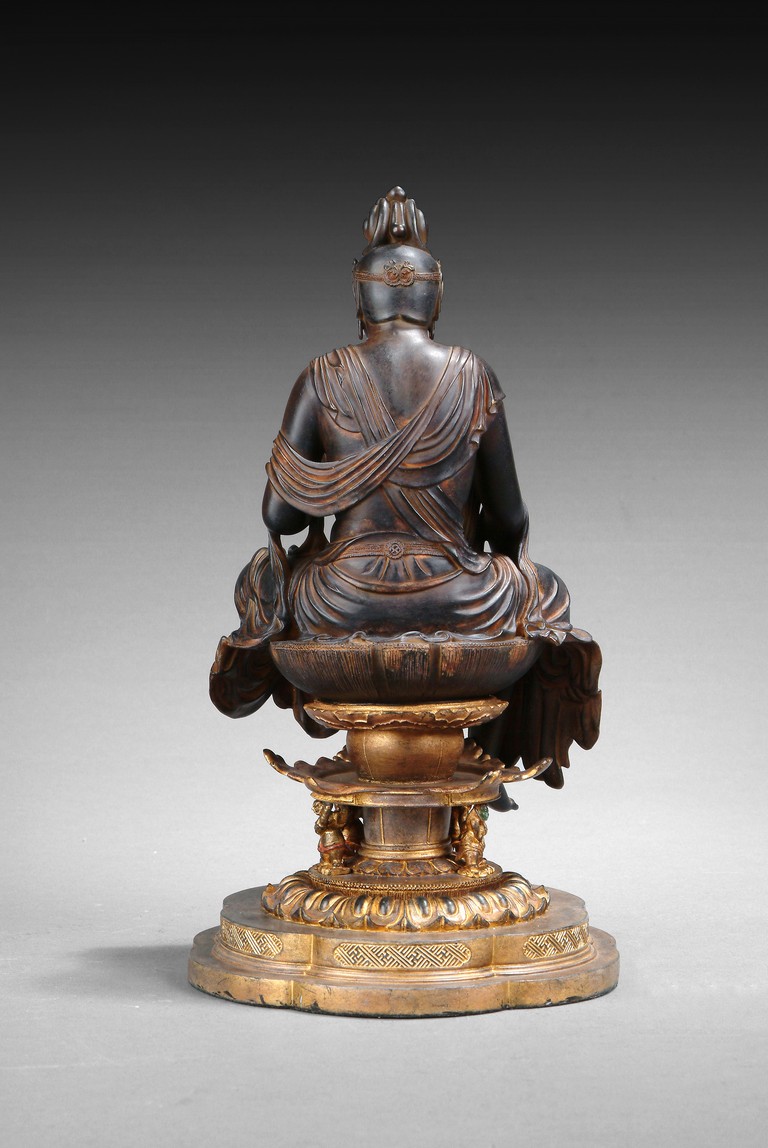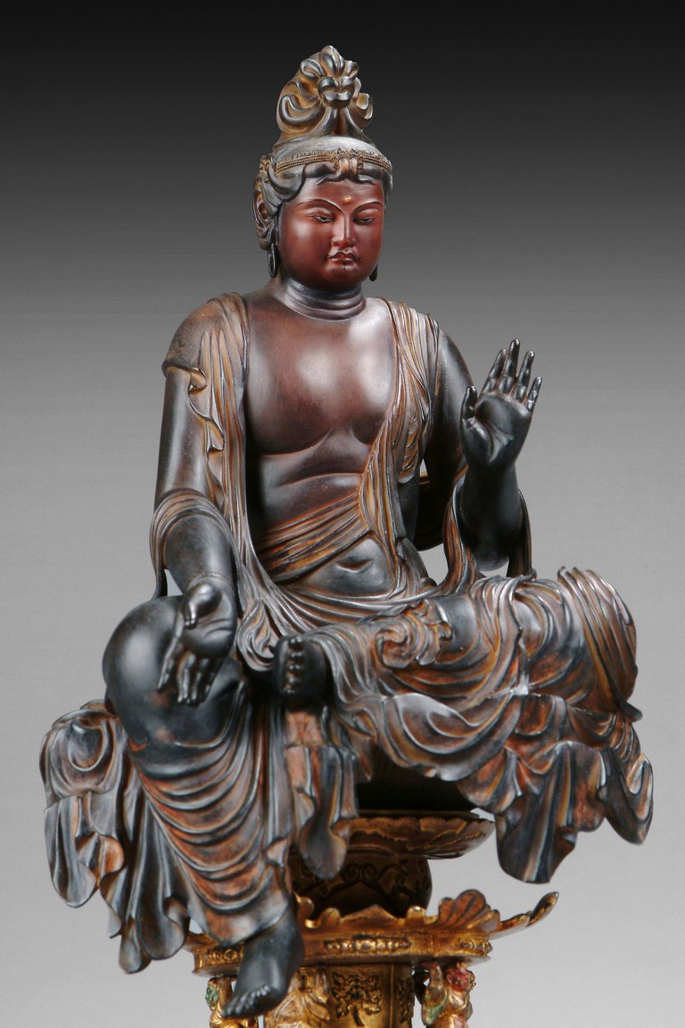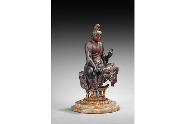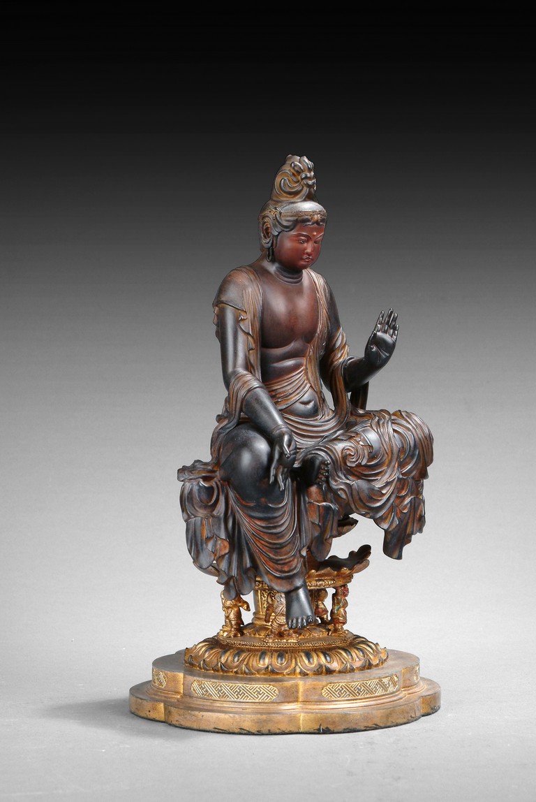 A wooden figure of Shakyamuni seated in Lalitasana atop of a lotus shaped tall seat