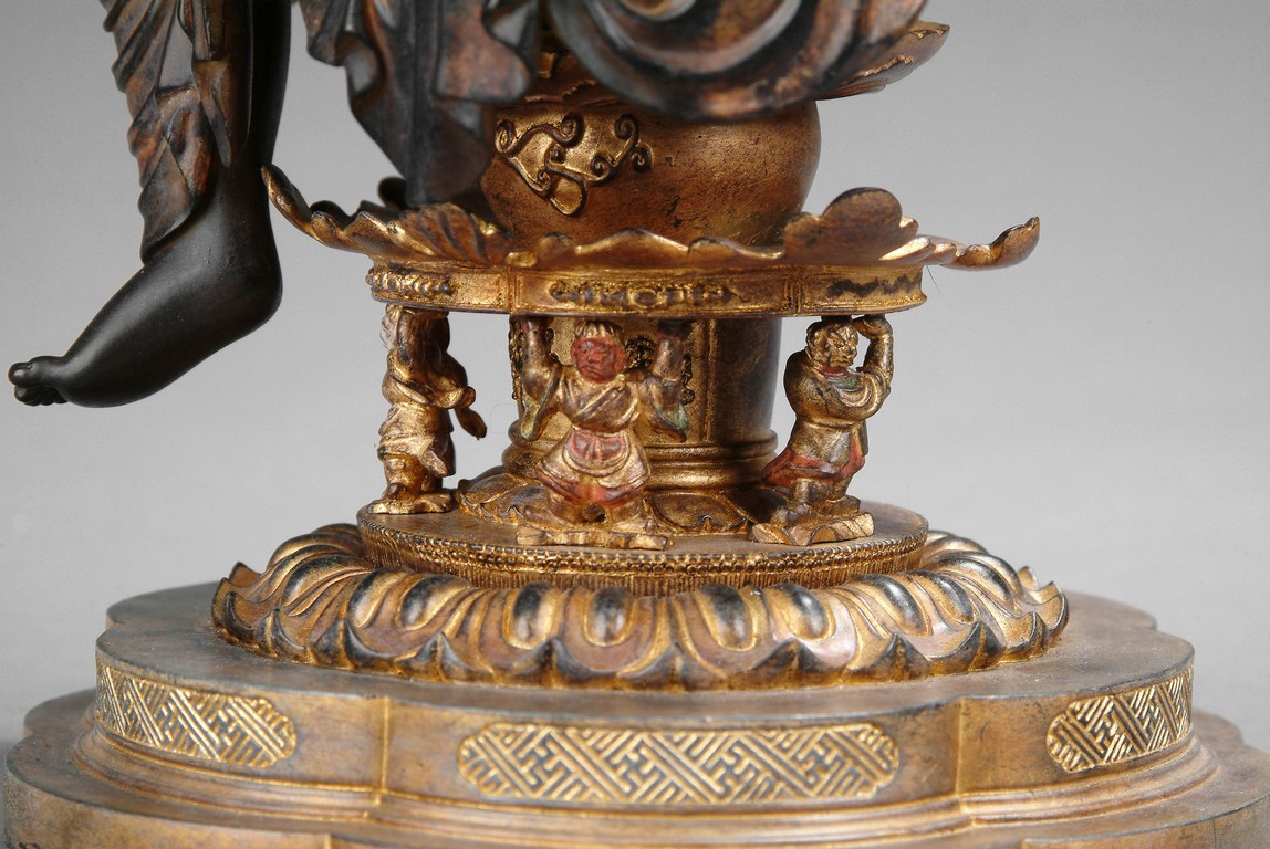 supported by four small figures. The Buddha is dressed in robe open at the chest left hand presenting Abhaya Mudra and right hand presenting Varada Mudra.