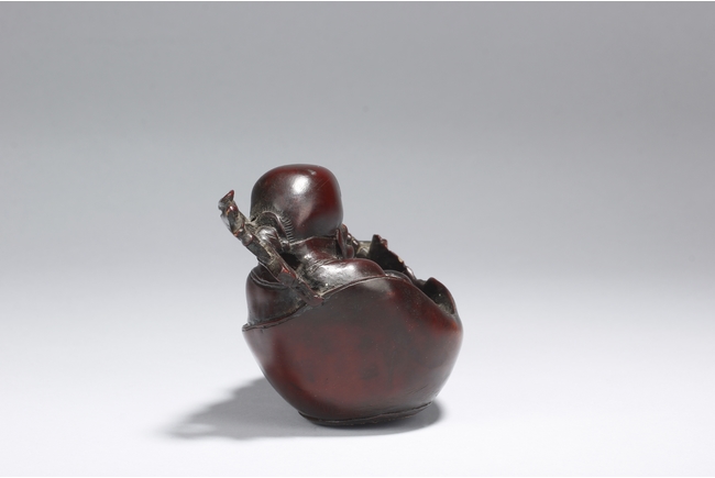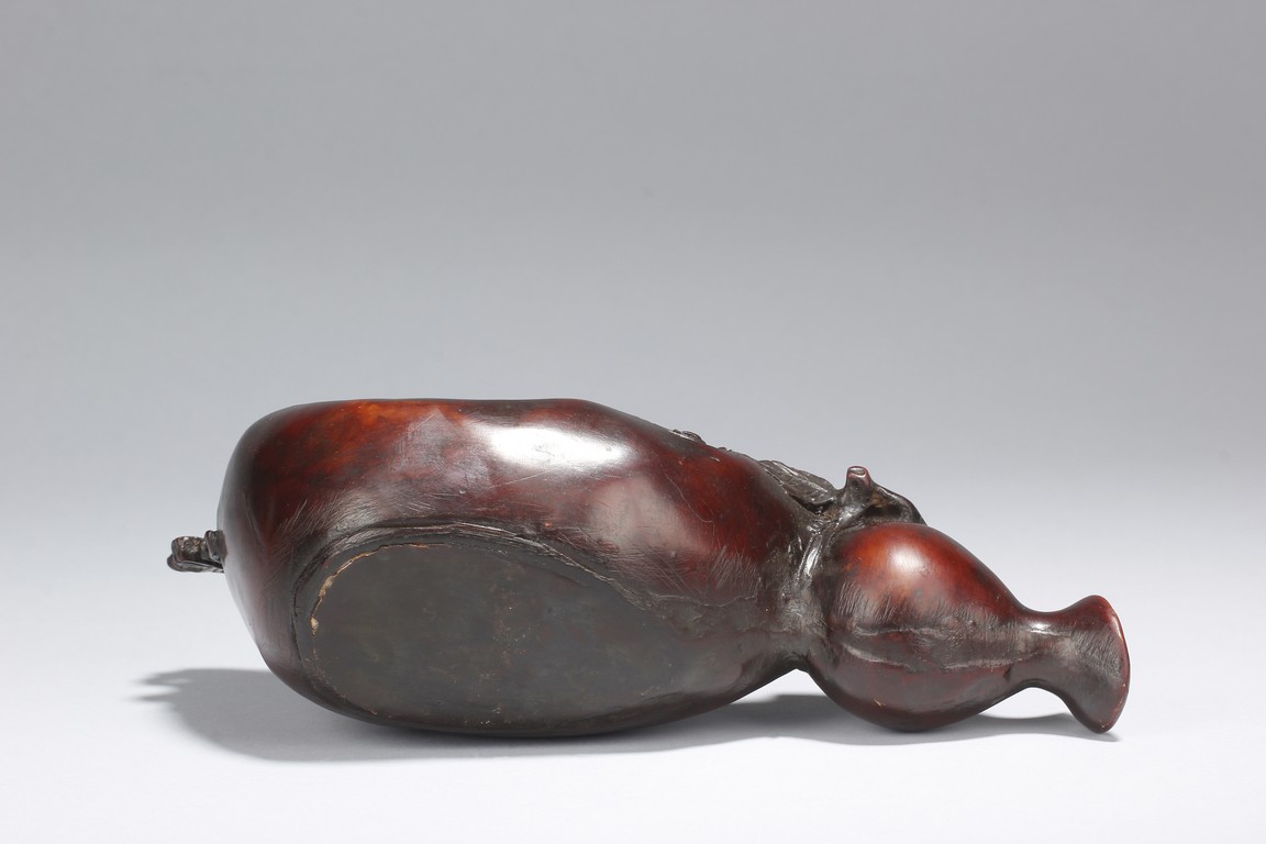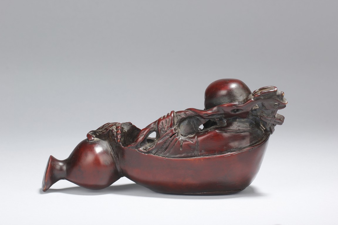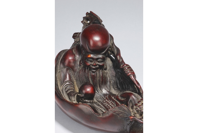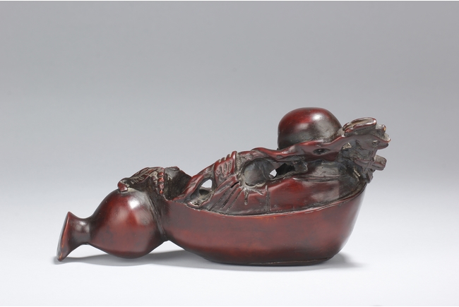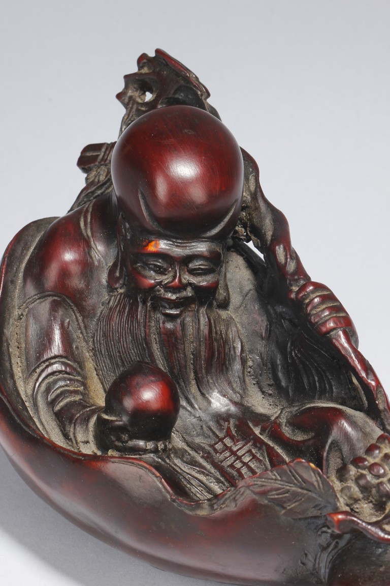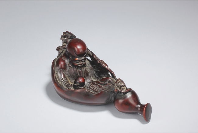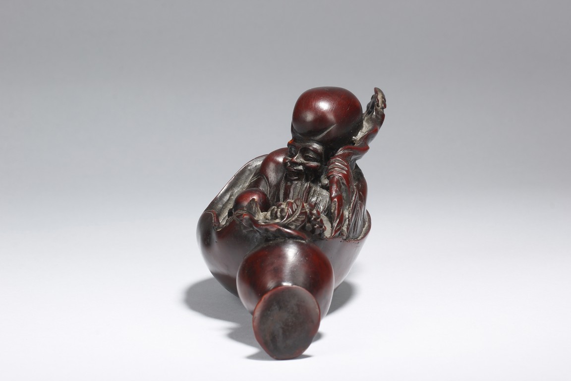 A fine wood carving figure of Shou Lao Immortal laying inside of a large half-gourd