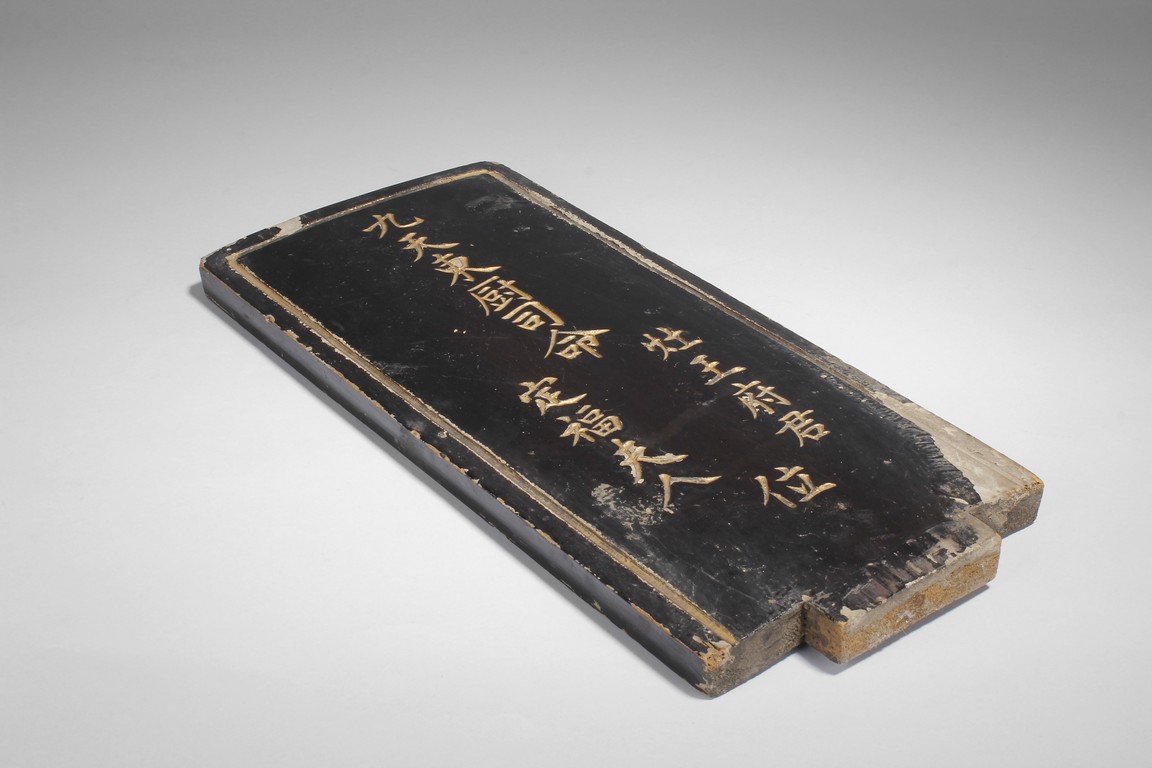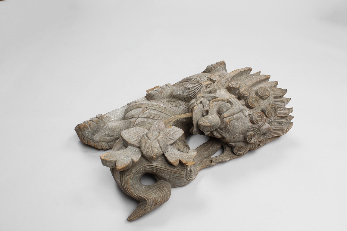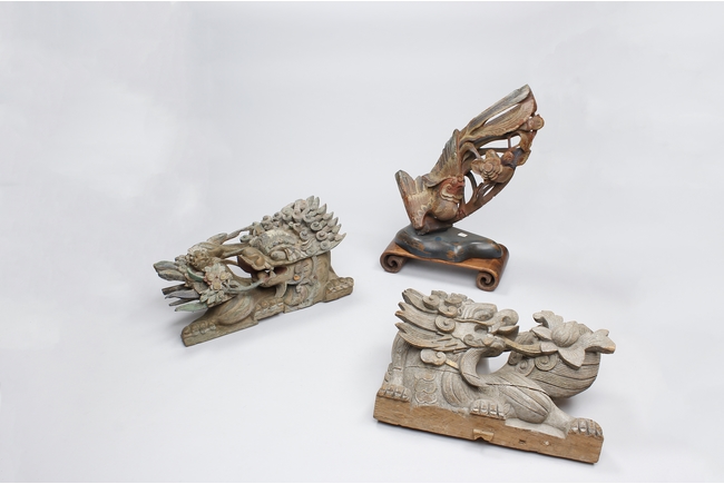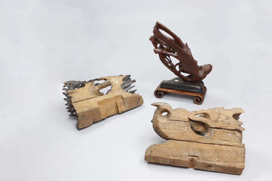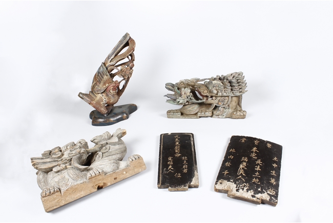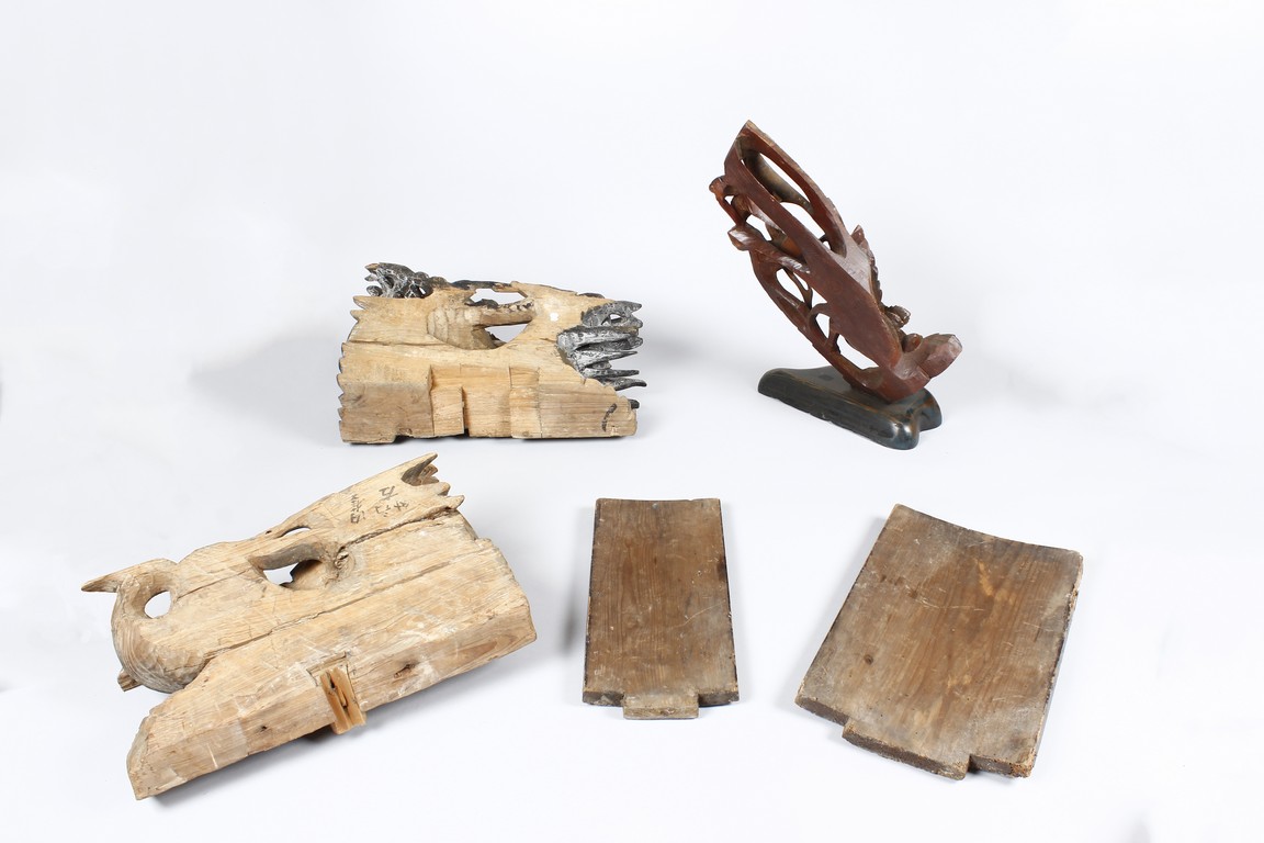 two differently designed wood carved dragons with insertion pins and two ancestor memorial tablets with names.