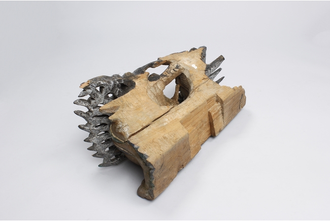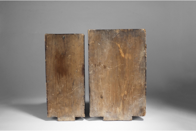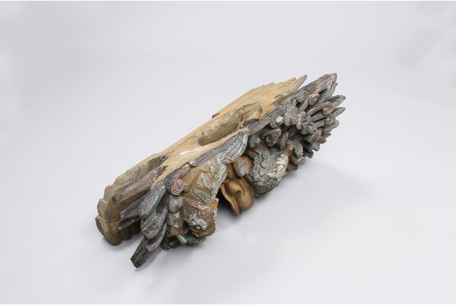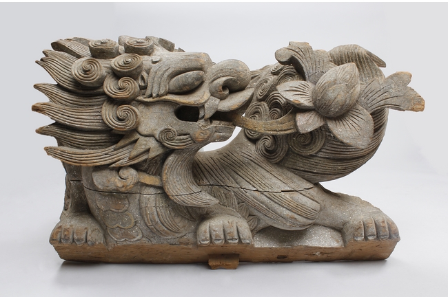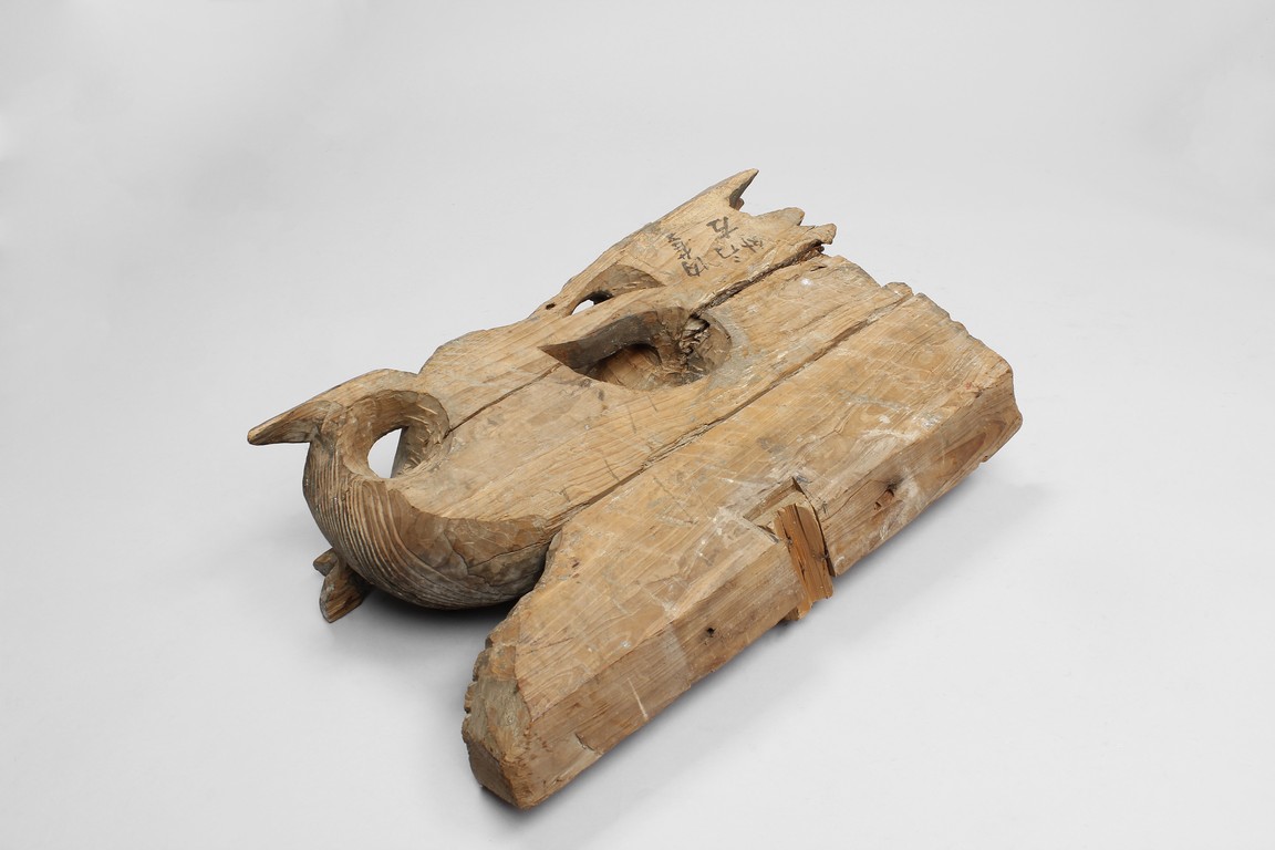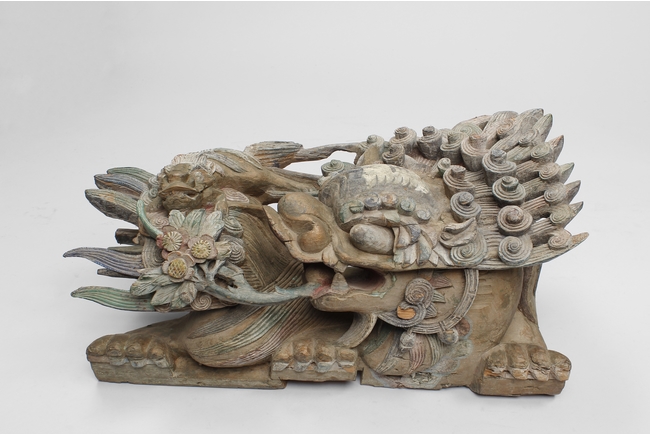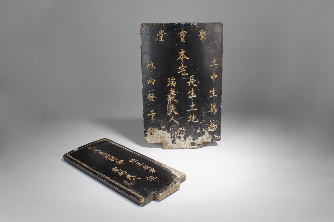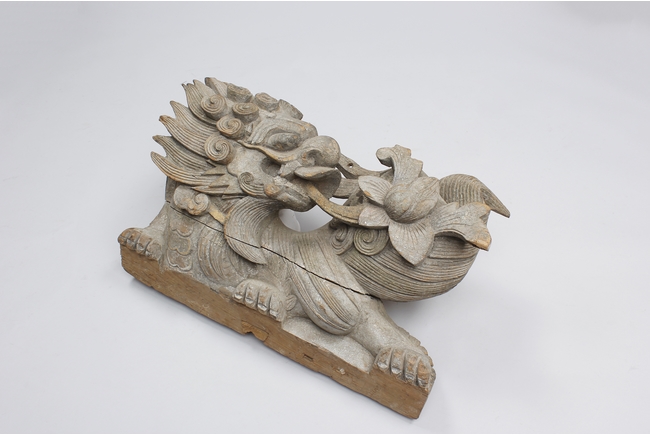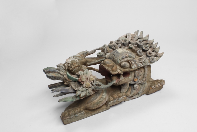 two differently designed wood carved dragons with insertion pins and two ancestor memorial tablets with names.