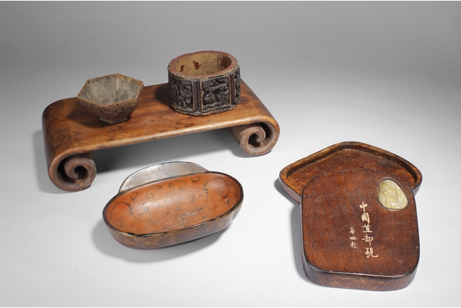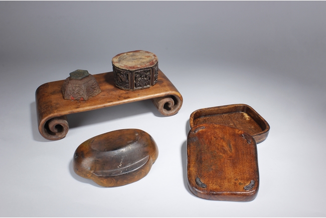 "The group includes a wooden ink stone box with a inlaid stone on the top surface of the case