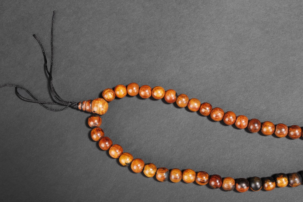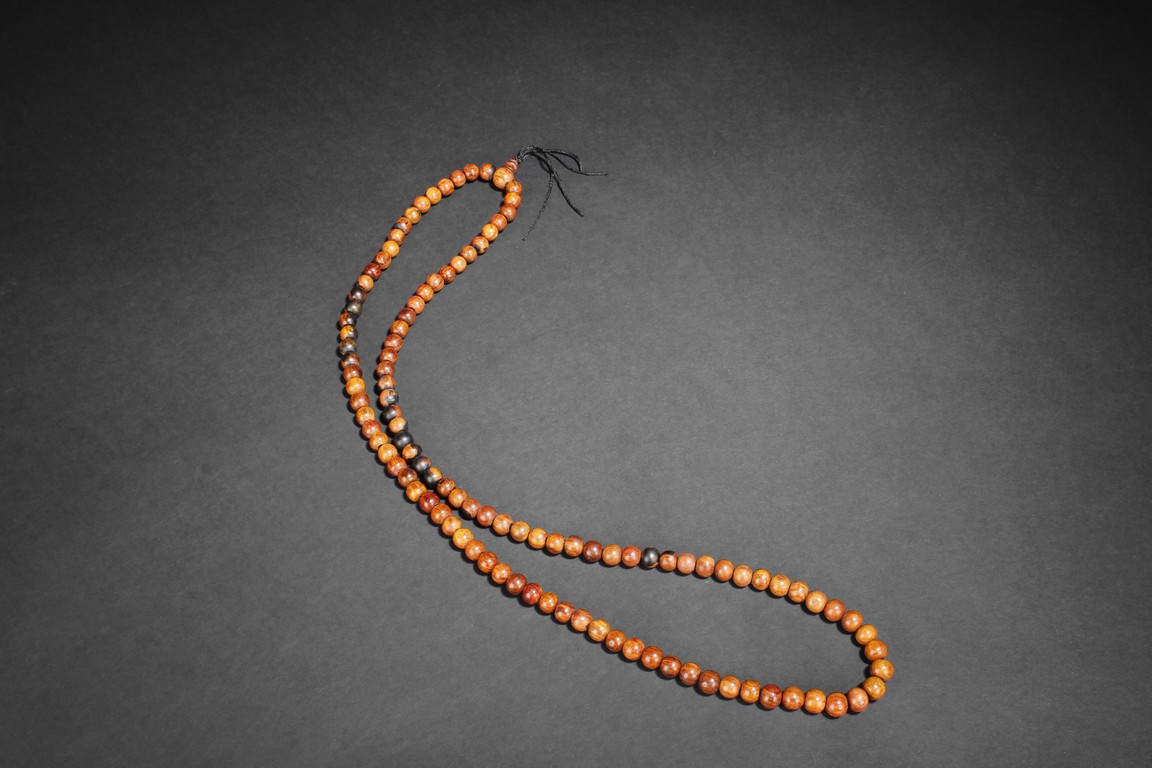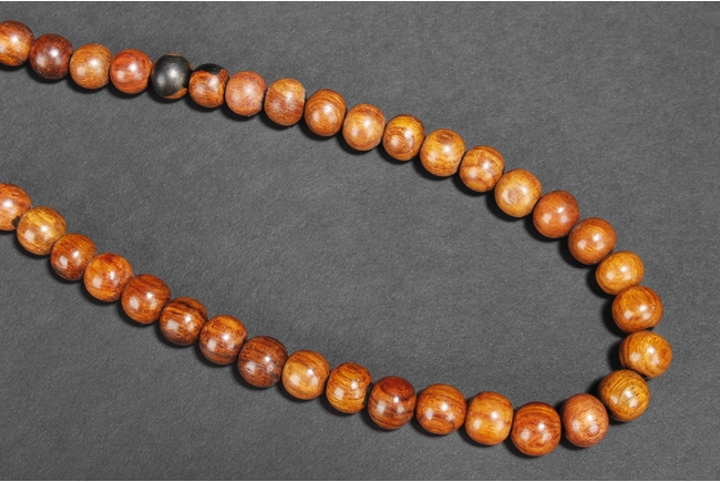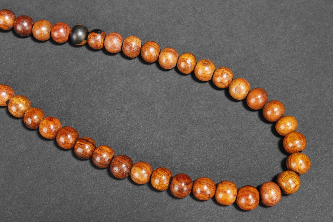 This prayer beads consists of 108 round wood beads with one bead in the shape of a gourd completing the string of beads.