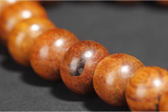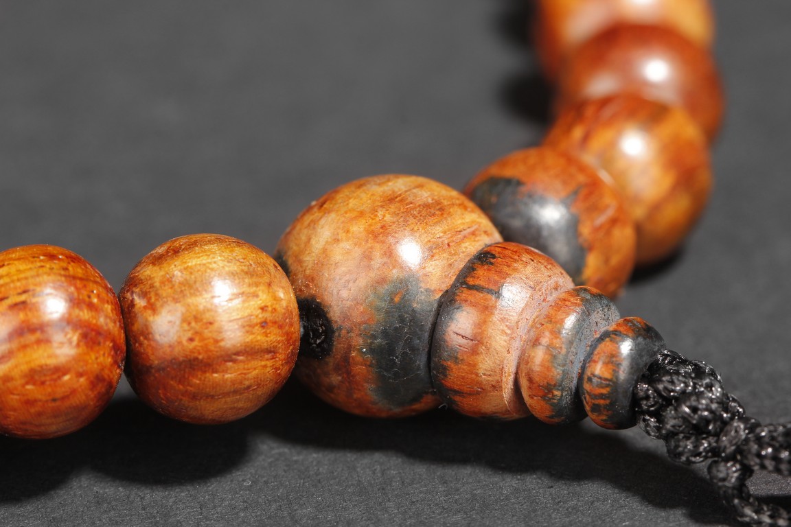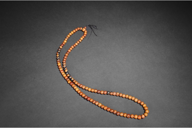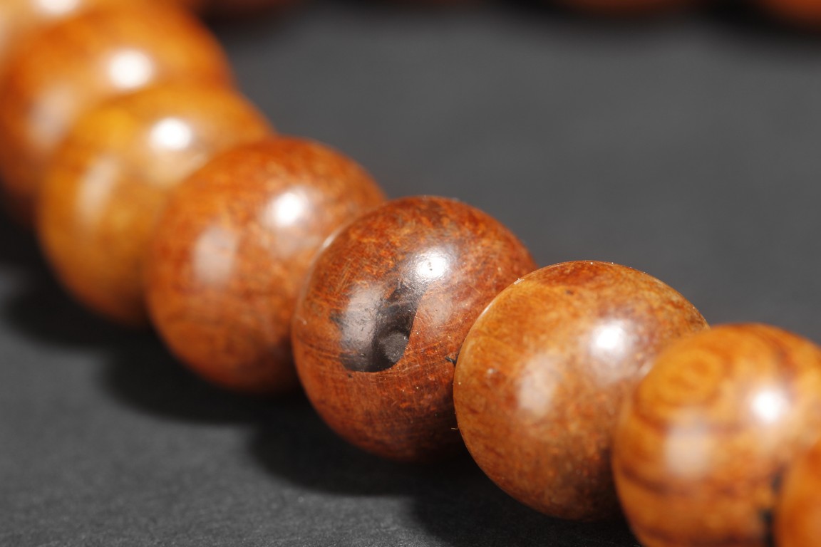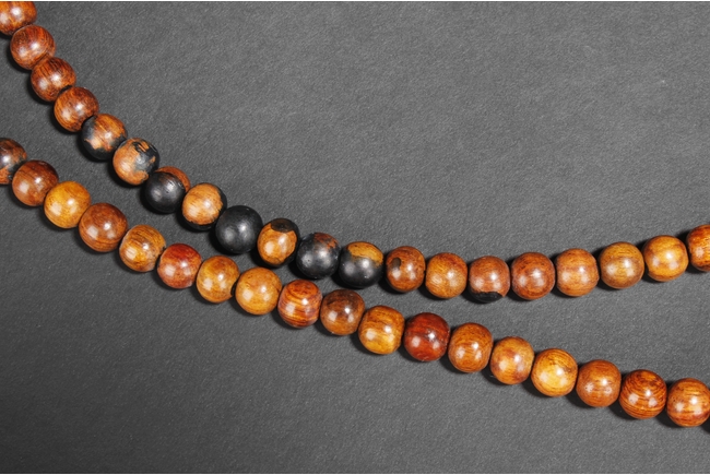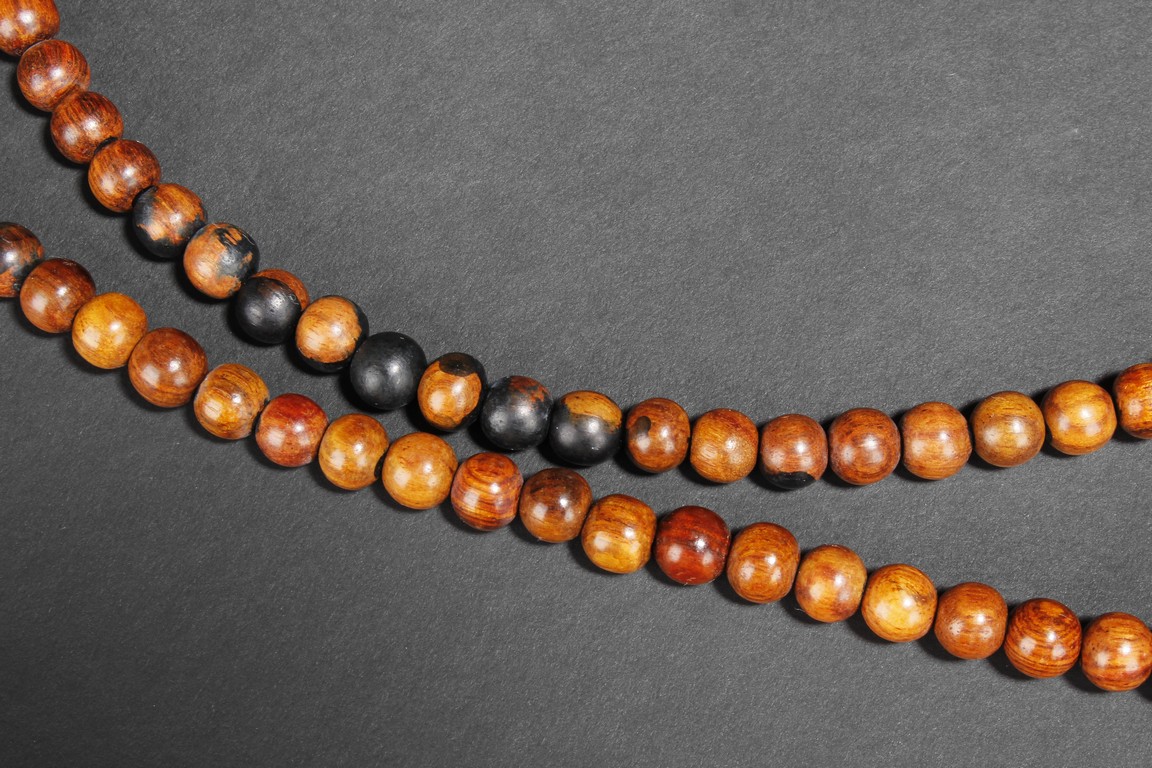 This prayer beads consists of 108 round wood beads with one bead in the shape of a gourd completing the string of beads.