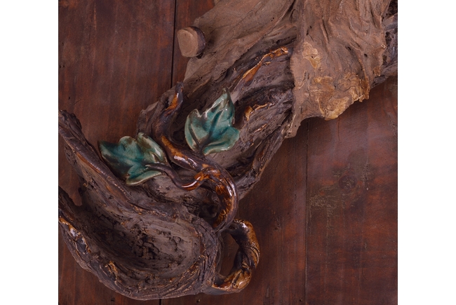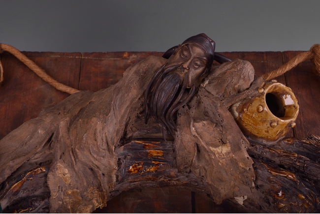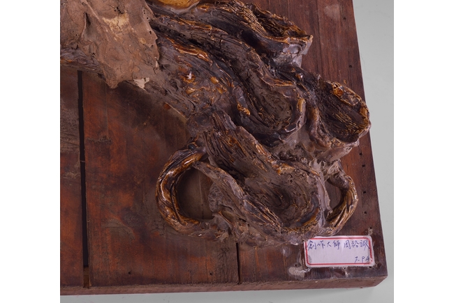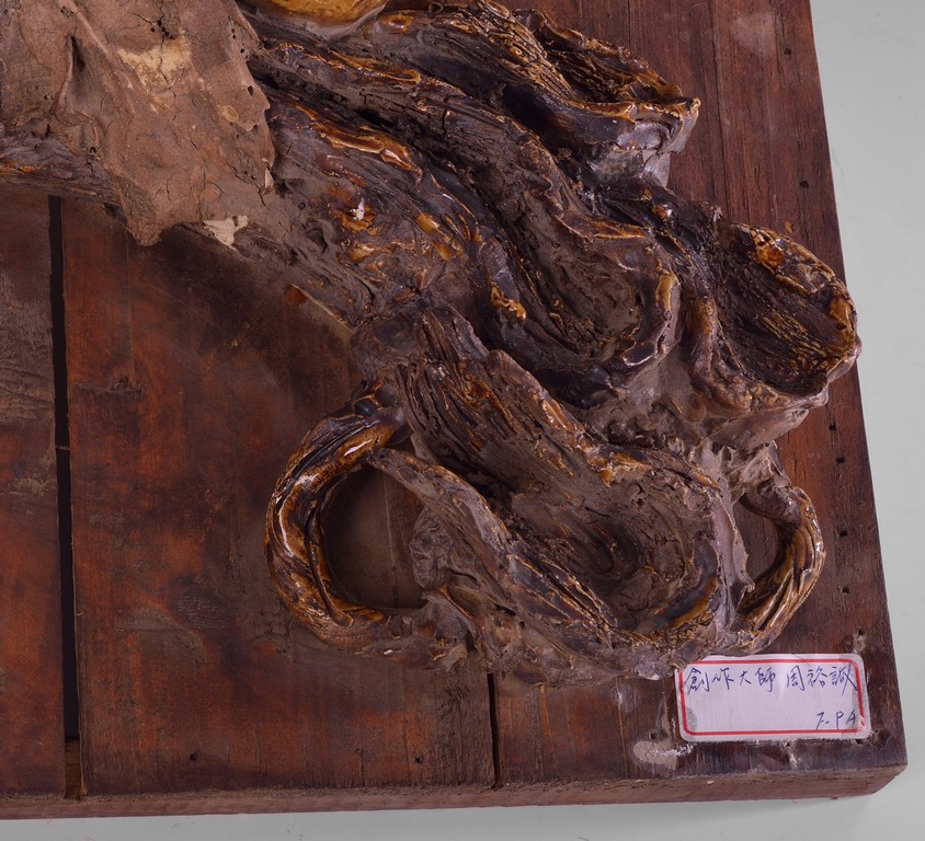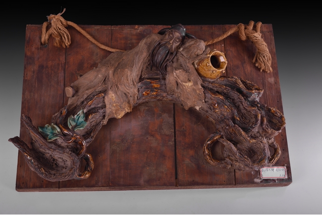 A Shiwan sculptures depicting the poet Li Bai leaning against wine pot. The piece is latched to the wood panel