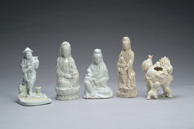 FIVE (5) BLANC DE CHINE FIGURES 德化壽桃童子, 送子觀音(三個),漁翁 一組