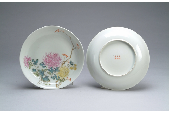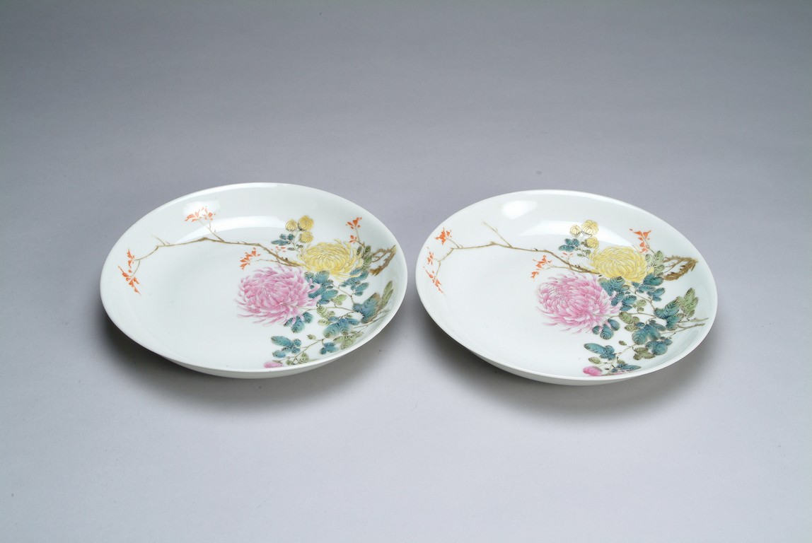 This pair of gorgeous dishes feature yellow and pink chrysanthemum flowers in the interior with branches and leaves drawings