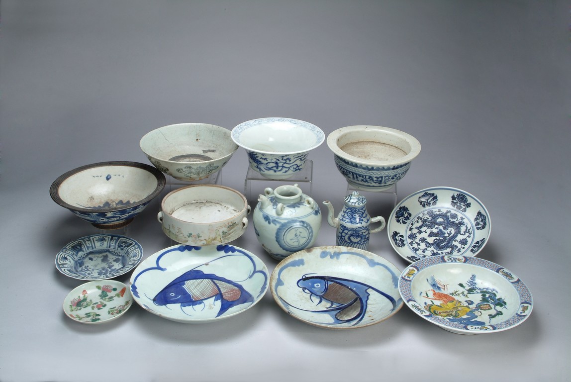 This set features thirteen different blue and white porcelain of various forms that includes bowl with scrolling flower design
