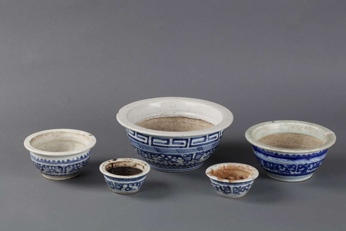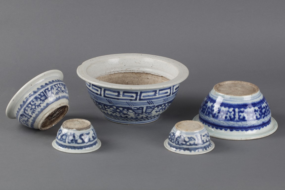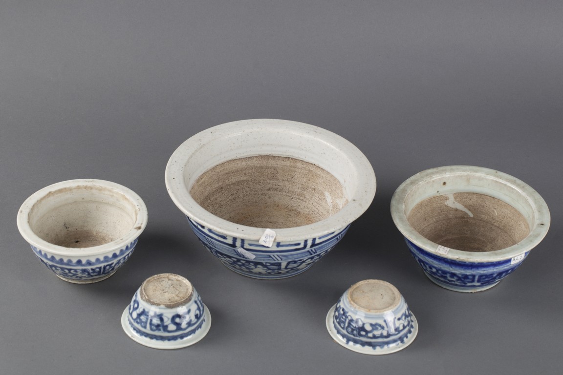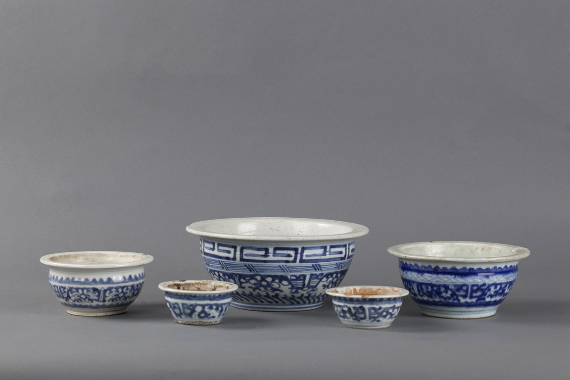 "The group of five blue and white bowls all raising with deep sides to rims but with different designs and sizes