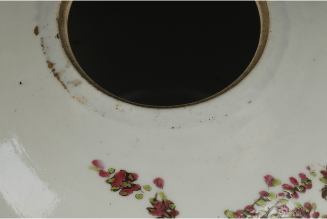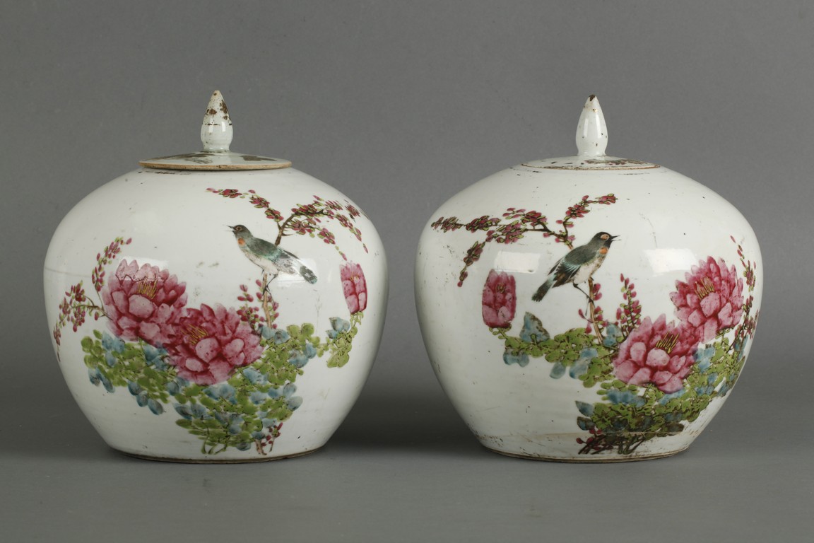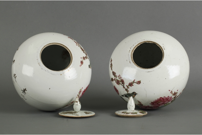 The rounded sides rising from a splayed foot to a slightly everted rim. Both painted with a profusion of flowers and a lone bird. Artist seal on the bottom and calligraphy on the back.