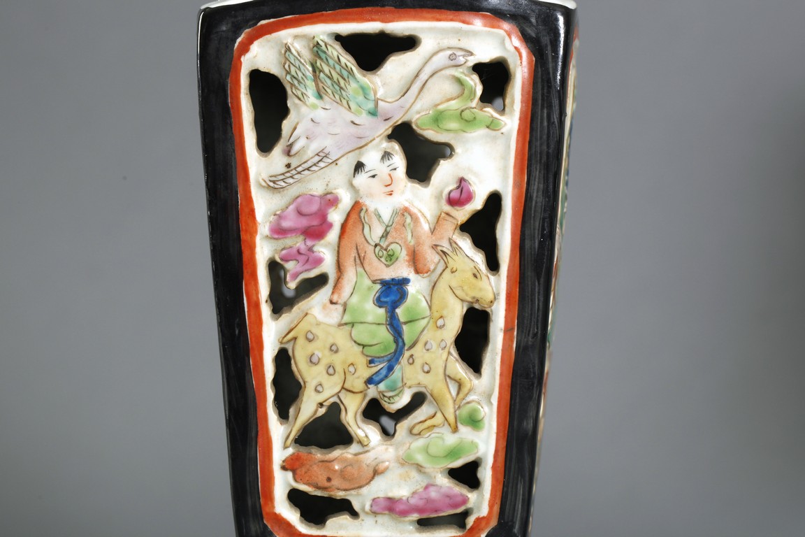 "Three porcelain made vases. Each depicting a different theme and shape. The first one