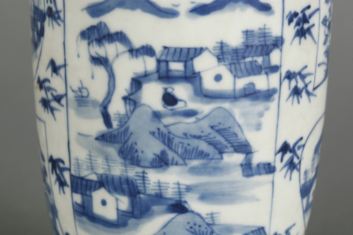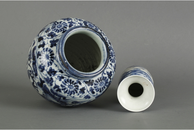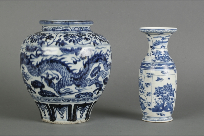 "Two blue and white porcelains of different sizes. The jar has a globular body and a short neck