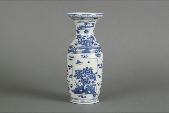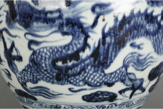 covered with a glaze of blue around the exterior with a continuous scene depicting a dragon and phoenix flower like patterns on the top. The blue and white vase depicts garden scenes with scrolling bands of different patterns.