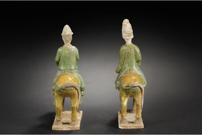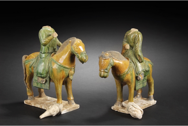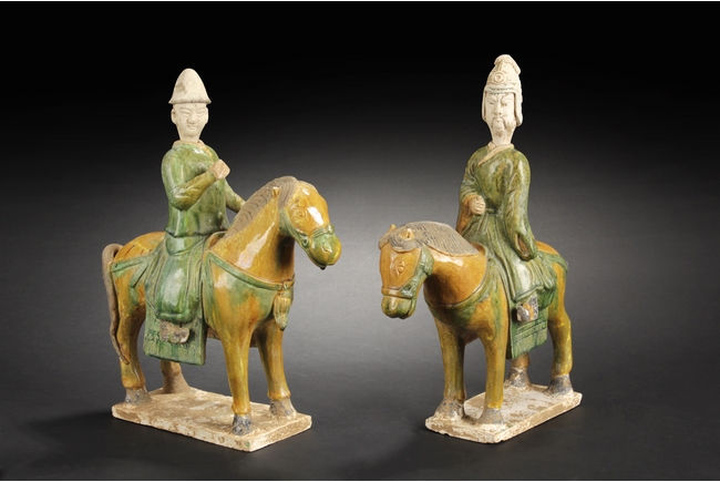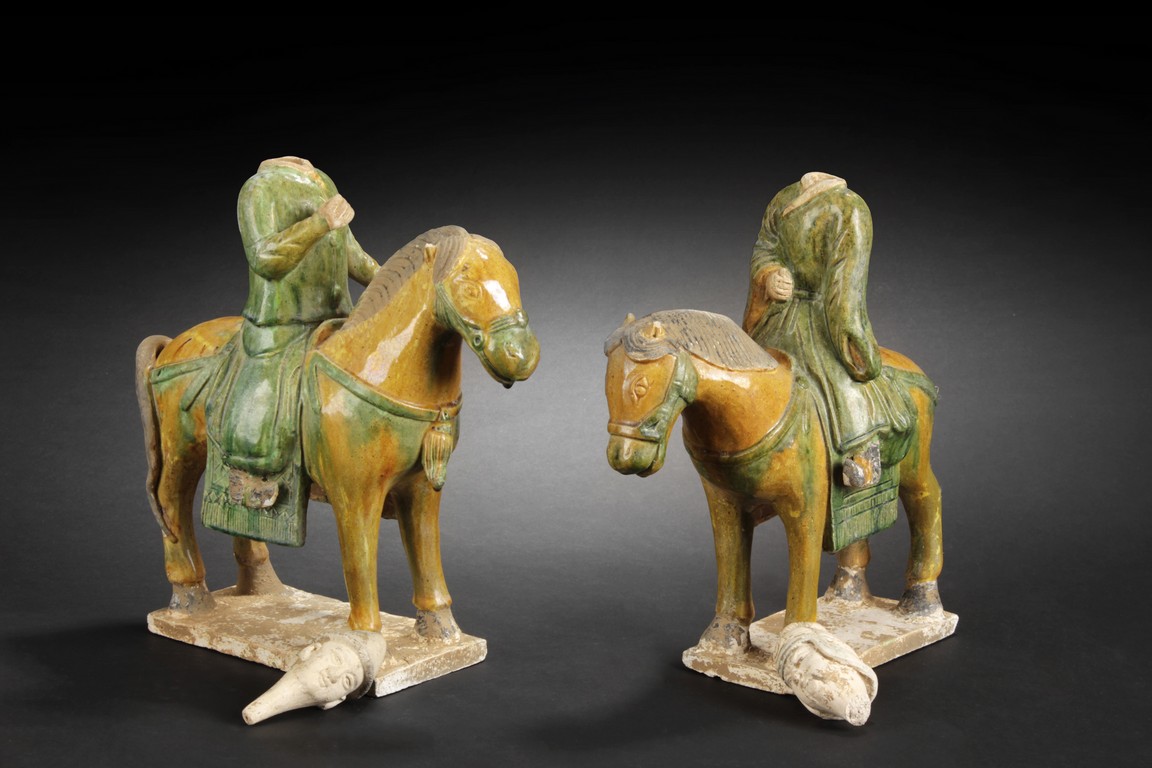"The pair of ceramic figures depict two men riding on horses
